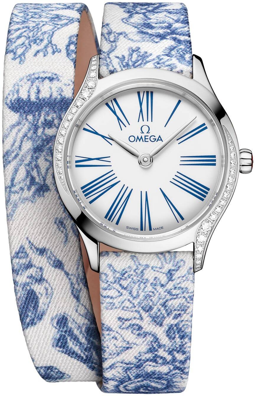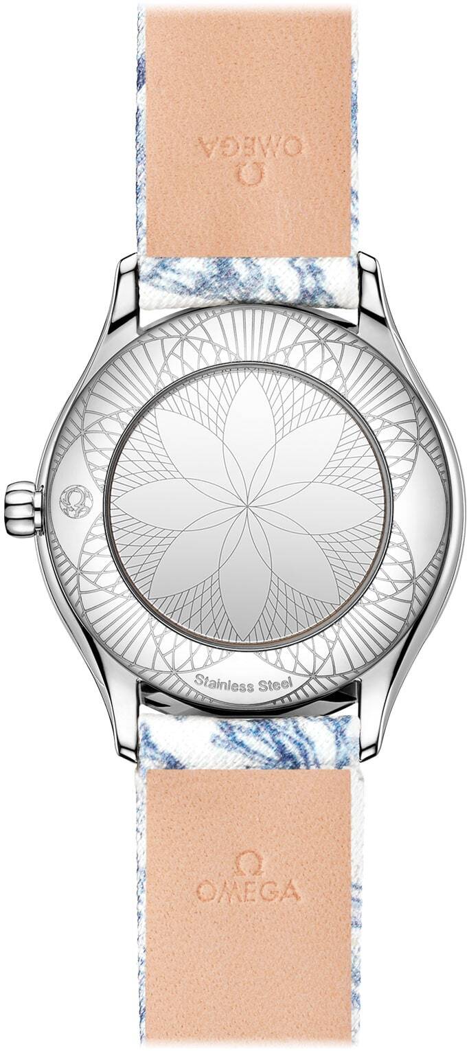 This watch is set on a unique Toile de Jouy “double tour” fabric bracelet with a blue sea design. Inside, the timepiece is driven by the OMEGA Calibre 4061, which sits behind a metallised sapphire crystal caseback with a mirror effect and “Her Time” pattern.