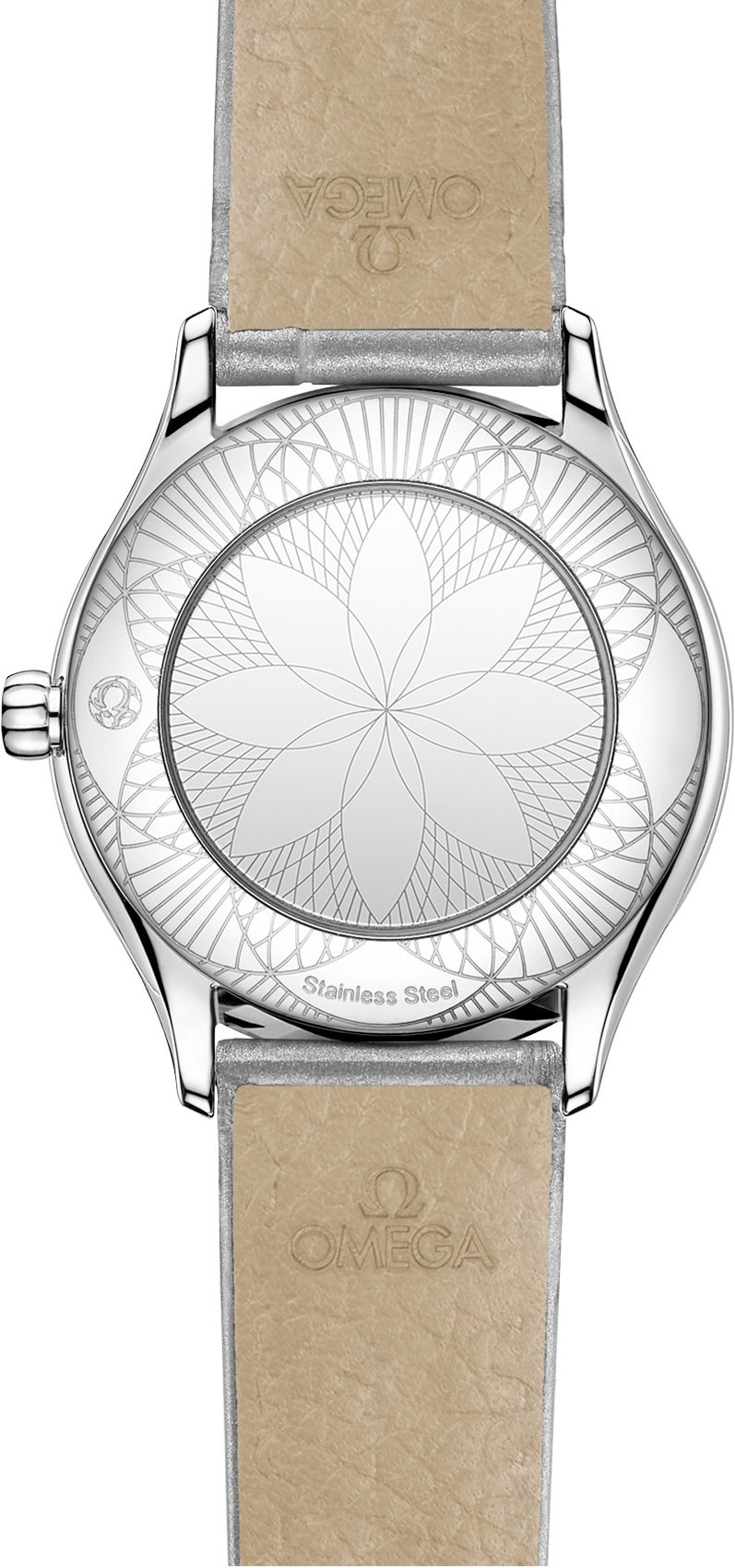 The watch is presented on a shimmering grey alligator leather strap with a Trésor buckle. It is driven by the OMEGA calibre 4061, which sits behind a special mirrored caseback with a metallised “Her Time” pattern.