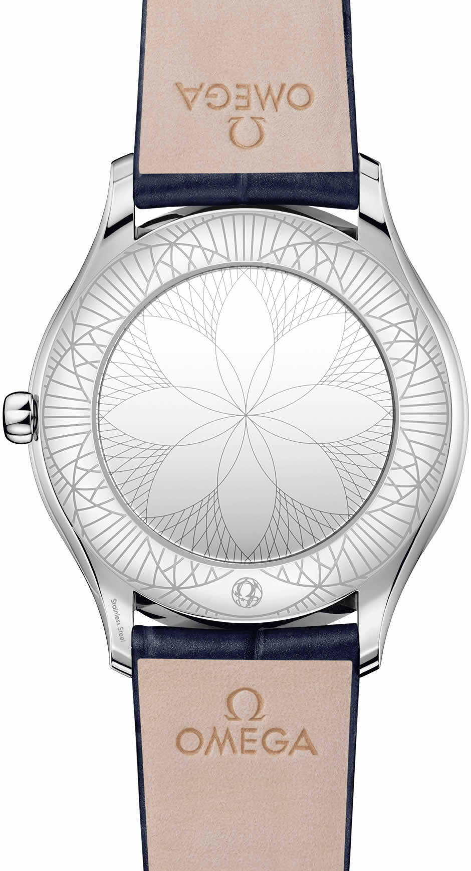 The watch is driven by the OMEGA calibre 4061, which sits behind a special mirrored caseback with a “Her Time” pattern. Finally, the watch is presented on a blue leather strap.