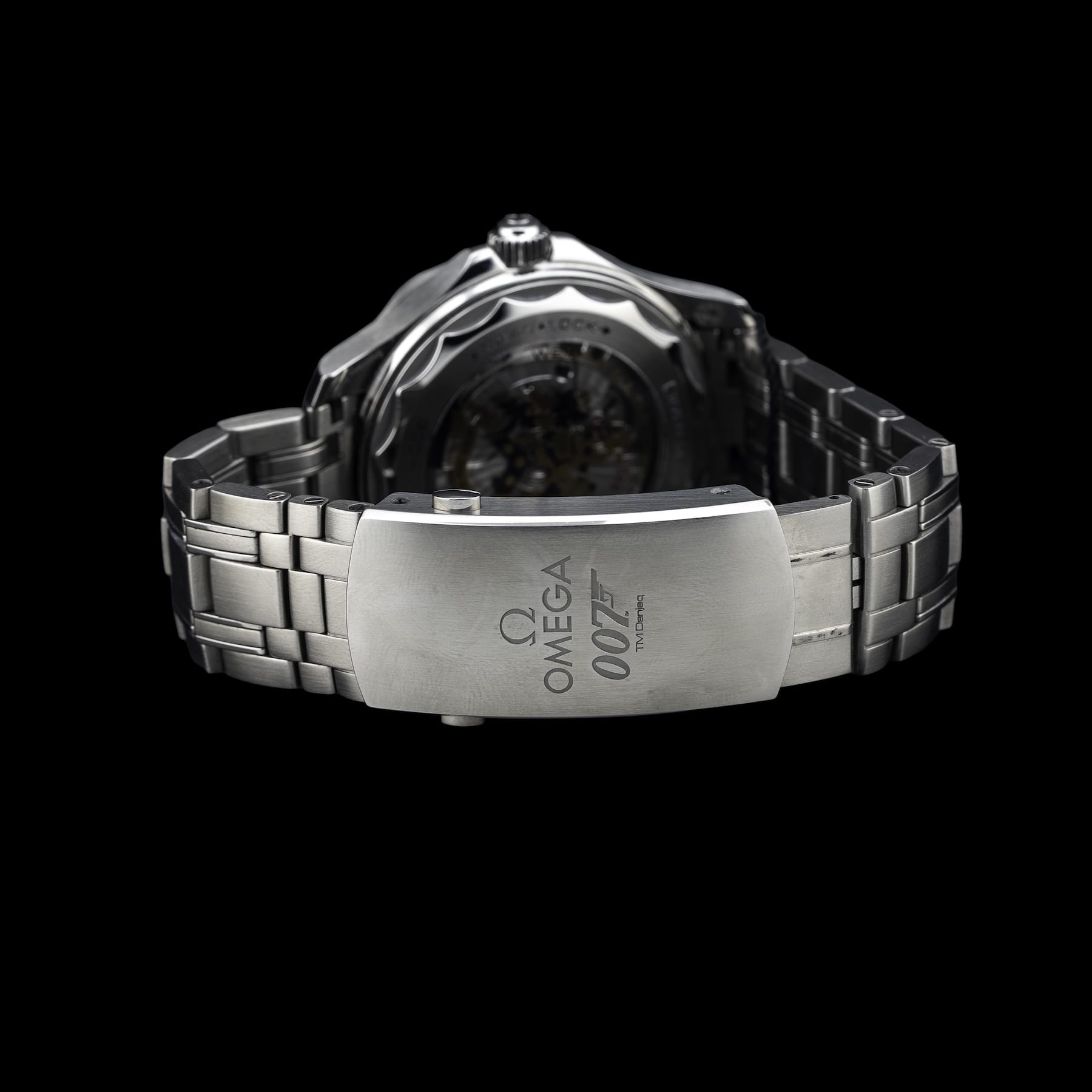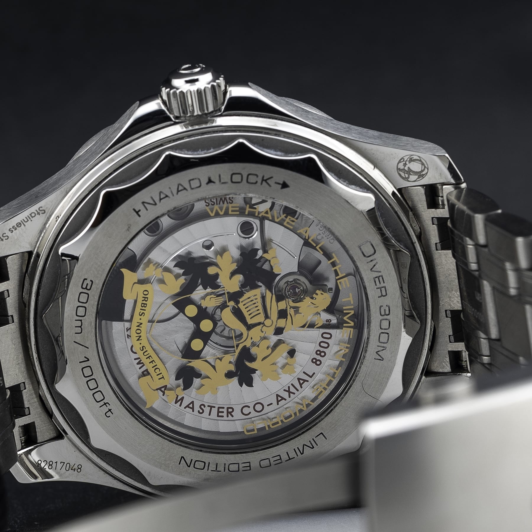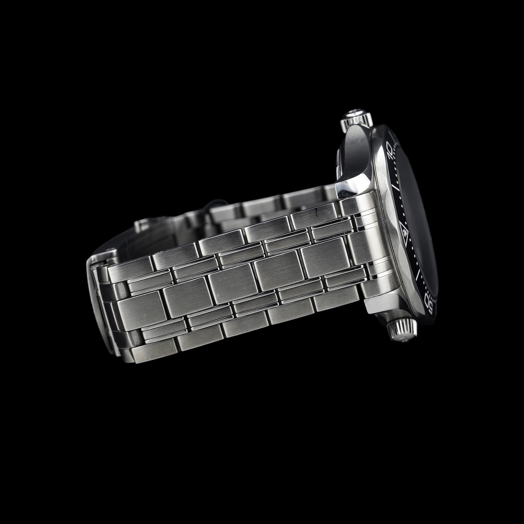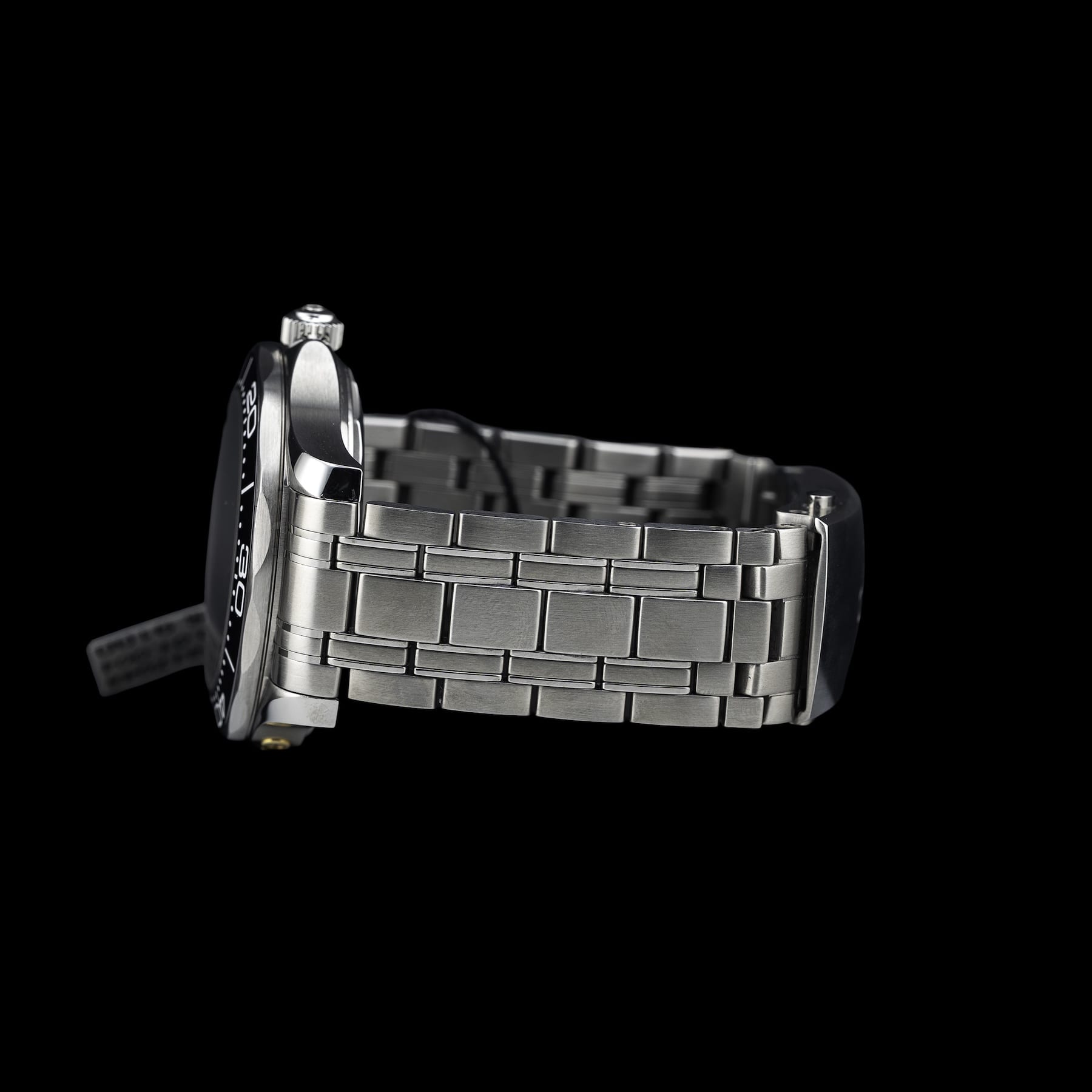 This watch features a 42mm stainless steel case on stainless steel strap. This watch also sports a black dial. Powered by a self-winding automatic movement. Water resistance up to 300 meters.