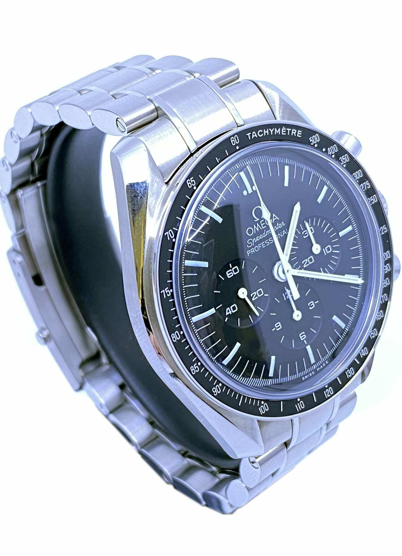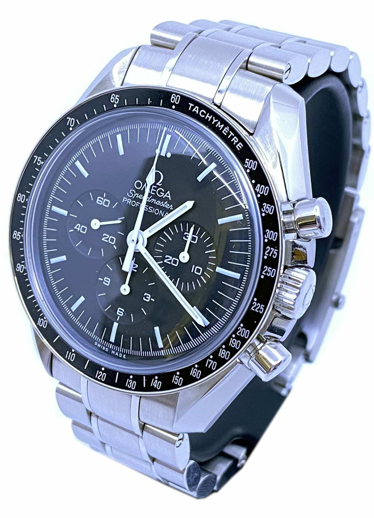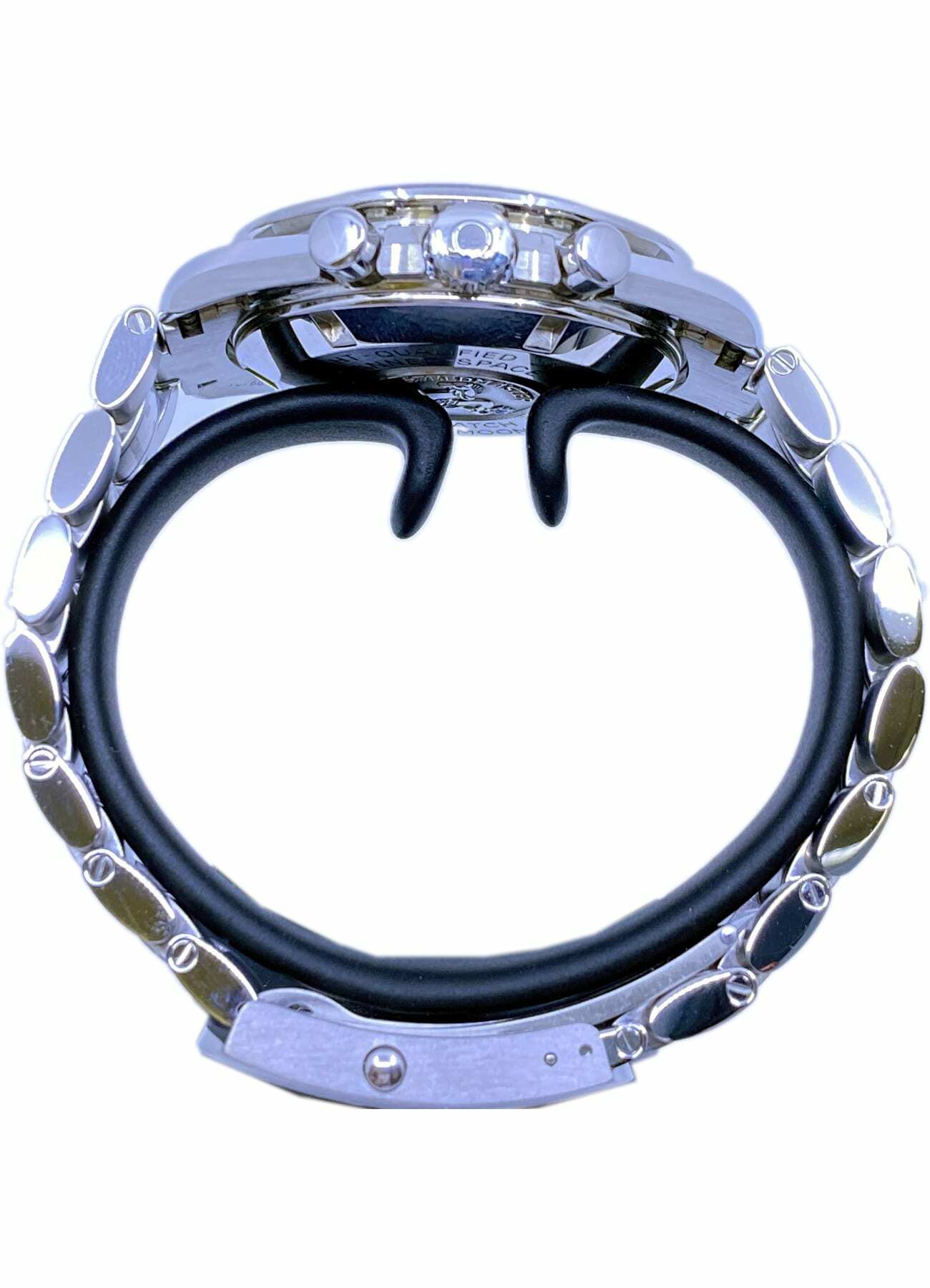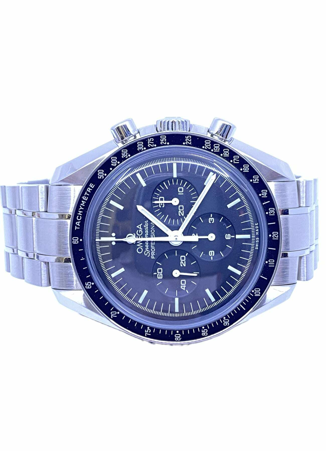 This OMEGA Speedmaster Professional “Moonwatch” features a black dial covered by a hesalite crystal and graced by a small seconds sub-dial, 30-minute recorder and 12-hour recorder along with a central chronograph hand. The black bezel, with its tachymetric scale, is mounted on a 42 mm stainless steel case and presented on a matching bracelet.