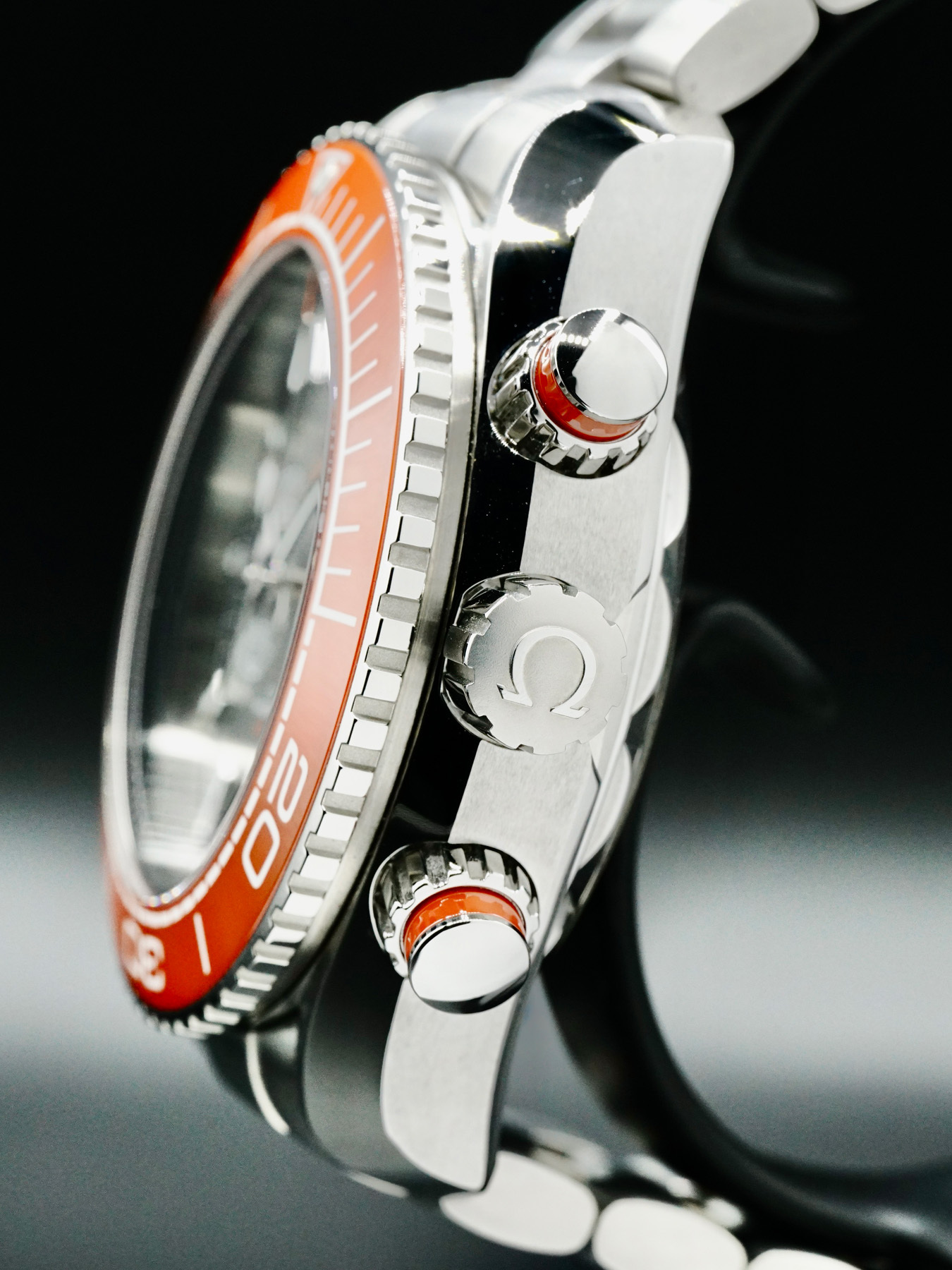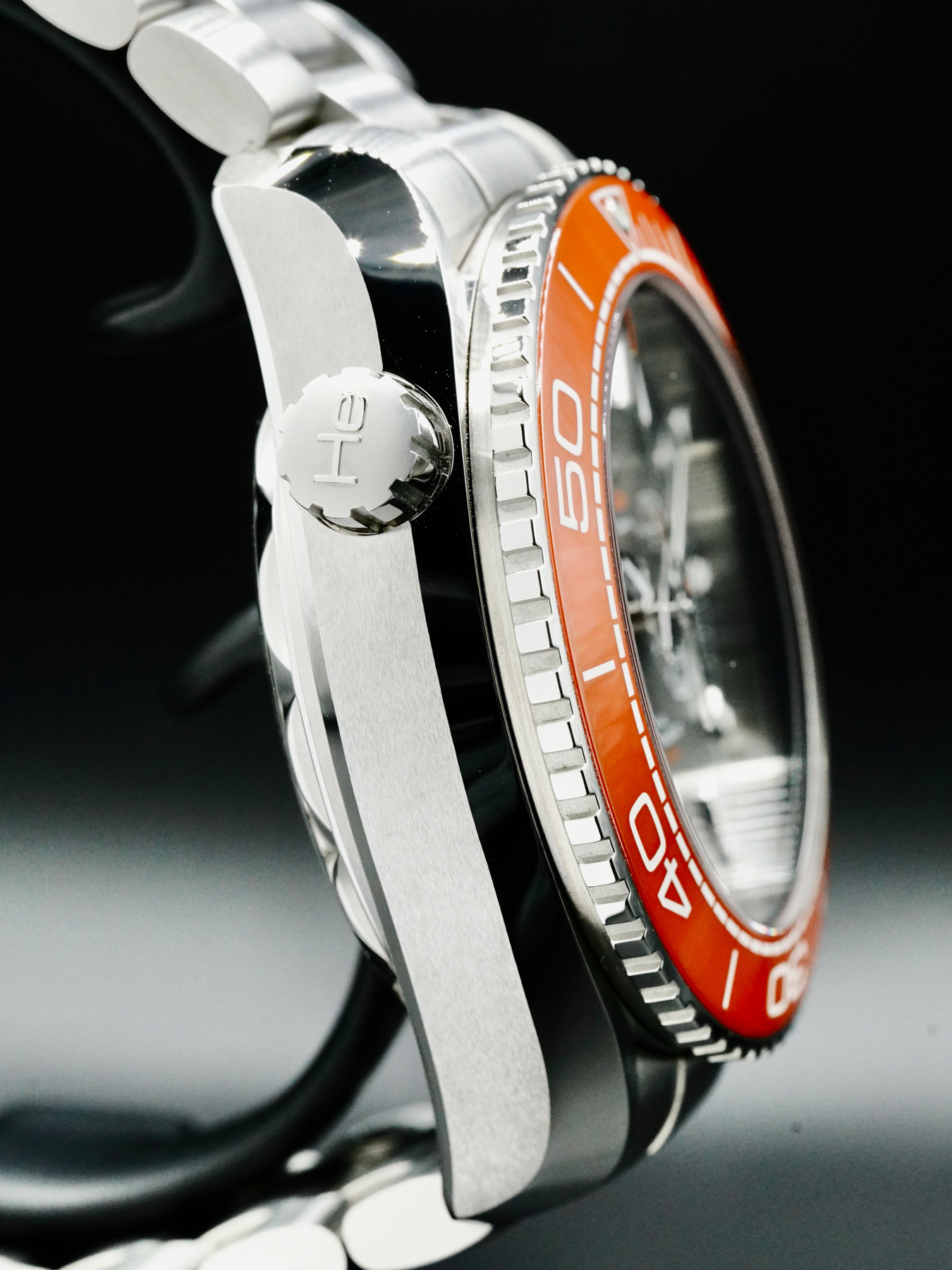 Orange ceramic is used on the rings of the pushers and also for the unidirectional bezel with its diving scale filled with liquid ceramic and Super-LumiNova.