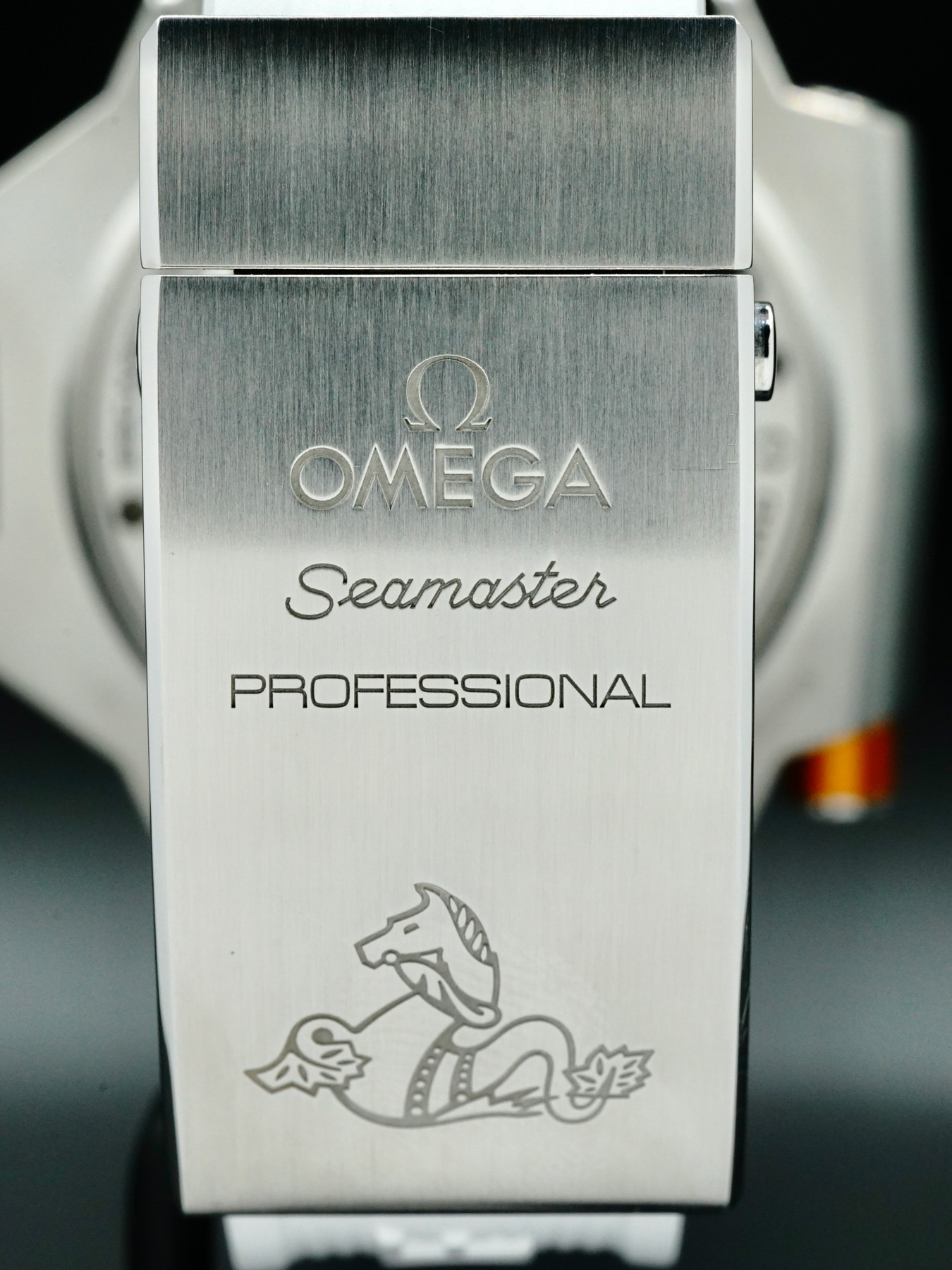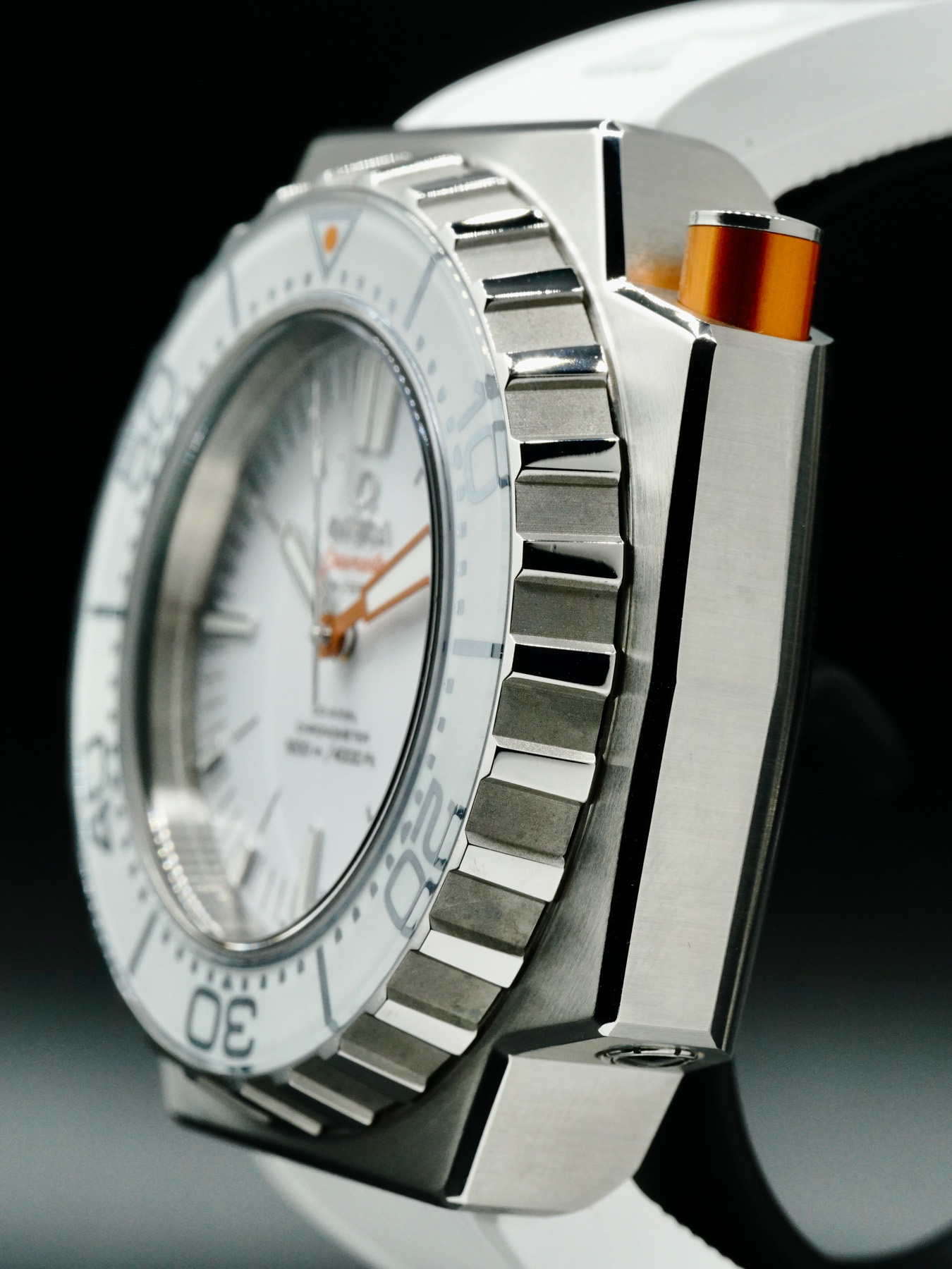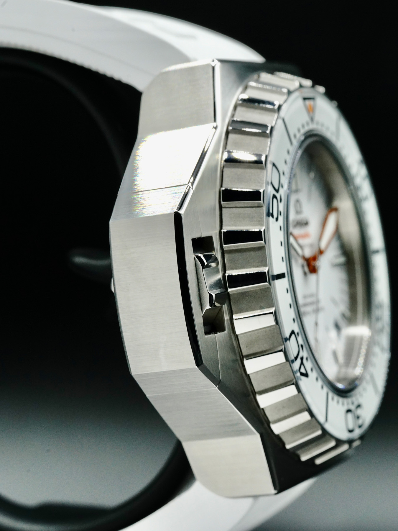 This Omega Ploprof 1200M Co-Axial 55 X 224.32.55.21.04.001 features a 48mm steel case on rubber strap. This watch also sports a white dial.