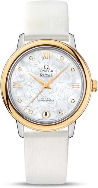 The 18K yellow gold bezel is mounted on a 32.7 mm stainless steel casebody and presented on a white satin-brushed leather strap. At the heart of this De Ville Prestige Butterfly" is the Co-Axial calibre 2500."