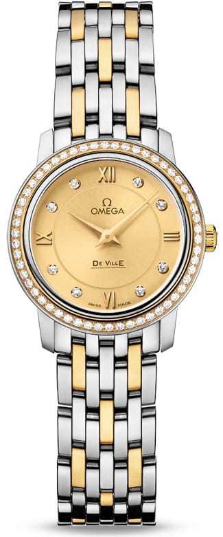 - This timepiece features a 24mm gold and steel and diamonds case paired with a high quality steel bracelet. It showcases a distinctive champagne dial and is powered by a precise quartz winding movement. The watch is designed with a water resistance of up to 30m.