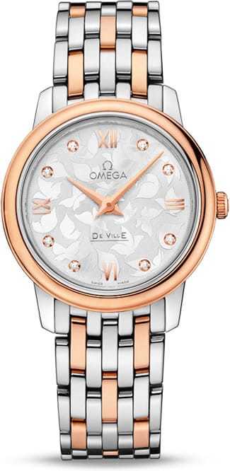 The 18K red gold bezel is mounted on a 27.4 mm stainless steel casebody and presented on a two-tone red gold-steel bracelet. At the heart of this De Ville Prestige "Butterfly" is the OMEGA quartz calibre 1376."