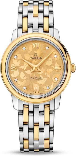 The OMEGA De Ville Prestige 'Butterfly' is a timepiece of true beauty that draws on the enchantment and aesthetics of nature. This model features a champagne diamond-set dial with a unique butterfly pattern achieved using a ramolayage, or pounced ornament", technique. The 18K yellow gold bezel is mounted on a 27.4 mm stainless steel casebody and presented on a two-tone yellow gold-steel bracelet.