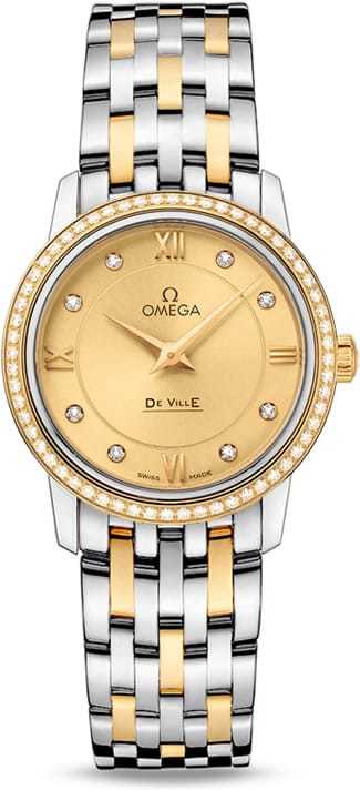 This model features a two-zone champagne dial with diamond-set indexes and gold-fashioned Roman numerals at the 3, 6, 9 and 12 o'clock positions. A scratch-resistant sapphire crystal covers this striking dial. The diamond-set, 18K yellow gold bezel is mounted on a 27.4 mm stainless steel casebody and is presented on a stainless steel and 18K yellow gold bracelet. This wristwatch is powered by OMEGA's calibre 1376, a precision quartz movement.