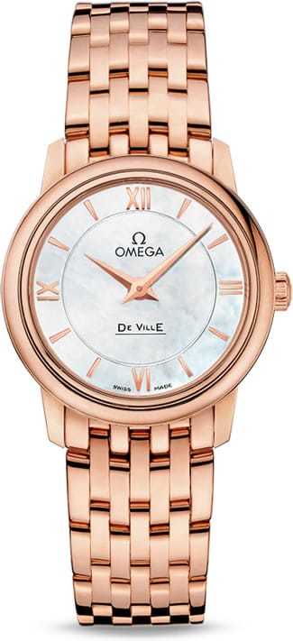 This model features a two-zone, white mother-of-pearl dial with gold-fashioned Roman numeral hour indexes at the 3, 6, 9 and 12 o'clock positions. A scratch-resistant sapphire crystal covers this striking dial. The bezel is mounted on a 27.4 mm 18K red gold case and is presented on an 18K red gold bracelet. This wristwatch is powered by OMEGA's calibre 1376, a precision quartz movement.