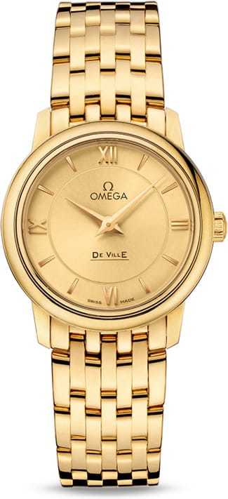 This model features a two-zone champagne dial with gold-fashioned Roman numeral hour indexes at the 3, 6, 9 and 12 o'clock positions. A scratch-resistant sapphire crystal covers this striking dial. The bezel is mounted on a 27.4 mm 18K yellow gold case and is presented on an 18K yellow gold bracelet. This wristwatch is powered by OMEGA's calibre 1376, a precision quartz movement.