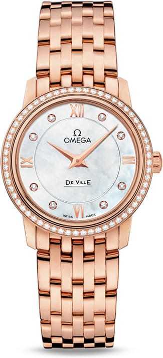 This model features a two-zone, white mother-of-pearl dial with diamond-set indexes and gold-fashioned Roman numerals at the 3, 6, 9 and 12 o'clock positions. A scratch-resistant sapphire crystal covers this striking dial. The diamond-set bezel is mounted on a 27.4 mm 18K red gold case and is presented on an 18K red gold bracelet. This wristwatch is powered by OMEGA's calibre 1376, a precision quartz movement.