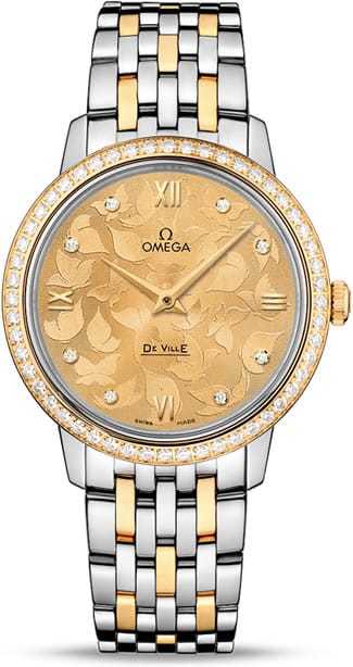 This model features a champagne diamond-set dial with a unique butterfly pattern achieved using a ramolayage, or pounced ornament", technique. The diamond-set 18K yellow gold bezel is mounted on a 32.7 mm stainless steel casebody and presented on a two-tone yellow gold-steel bracelet. At the heart of this De Ville Prestige "Butterfly" is the OMEGA quartz calibre 4061."