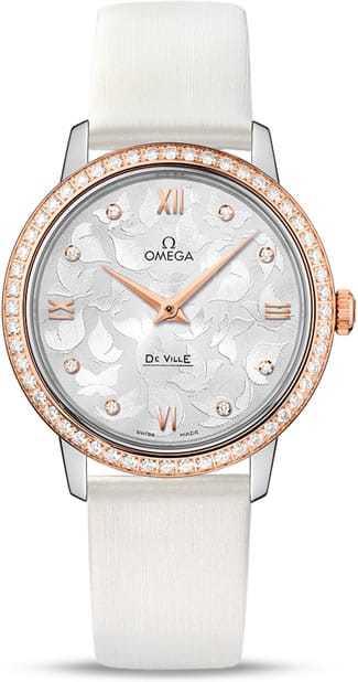This model features a silvery diamond-set dial with a unique butterfly pattern achieved using a ramolayage, or pounced ornament", technique. The diamond-set 18K red gold bezel is mounted on a 32.7 mm stainless steel casebody and presented on a white satin-brushed leather strap. At the heart of this De Ville Prestige "Butterfly" is the OMEGA quartz calibre 4061."