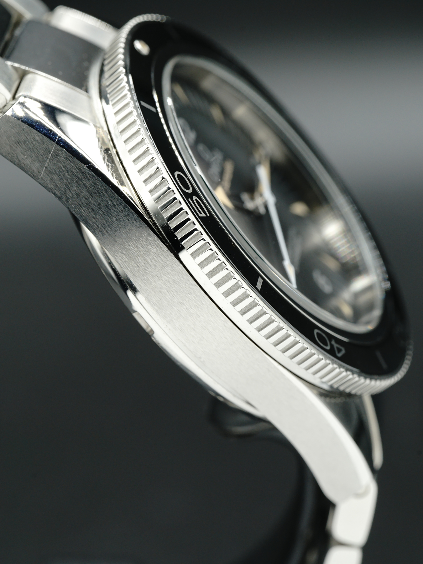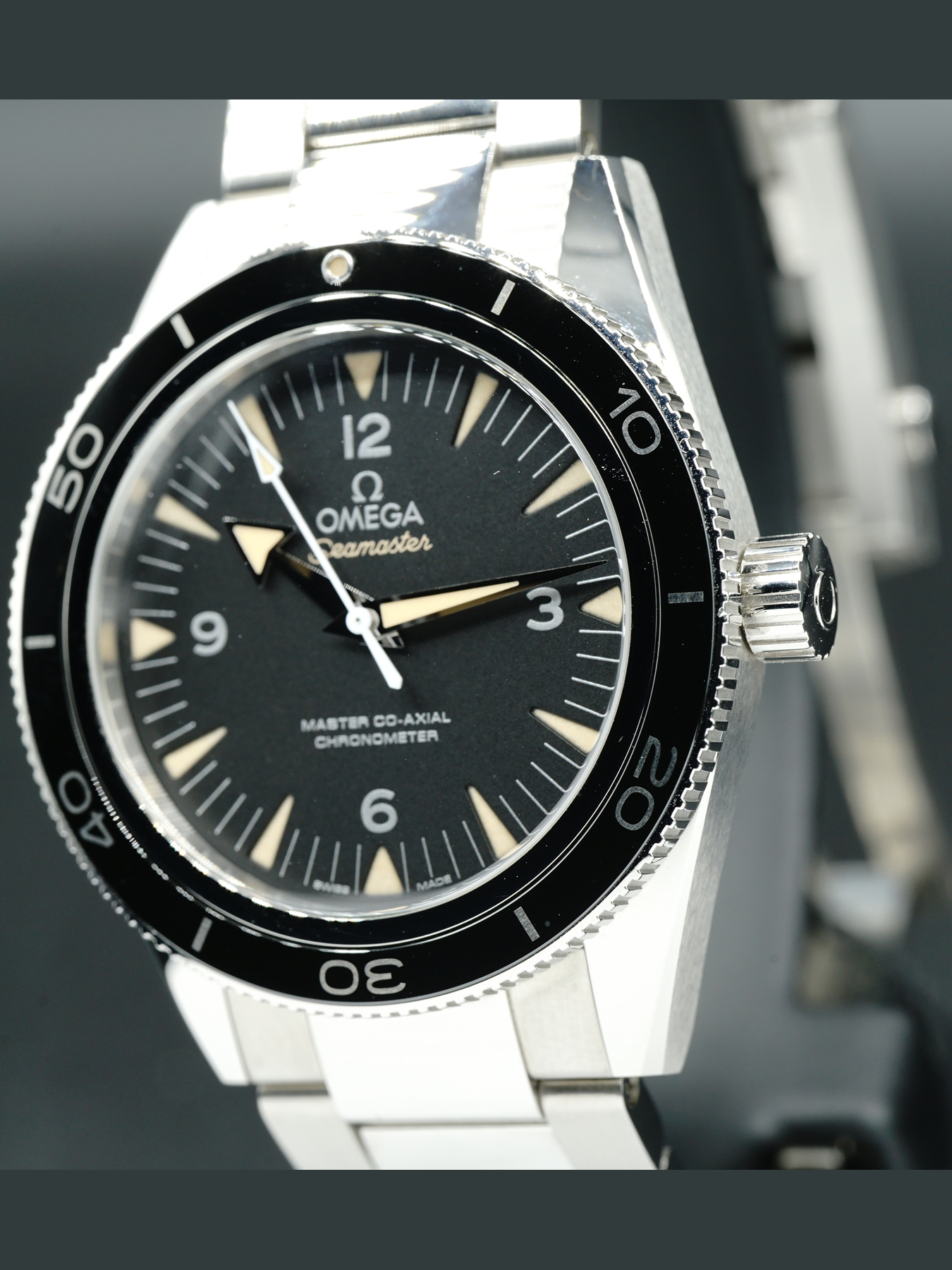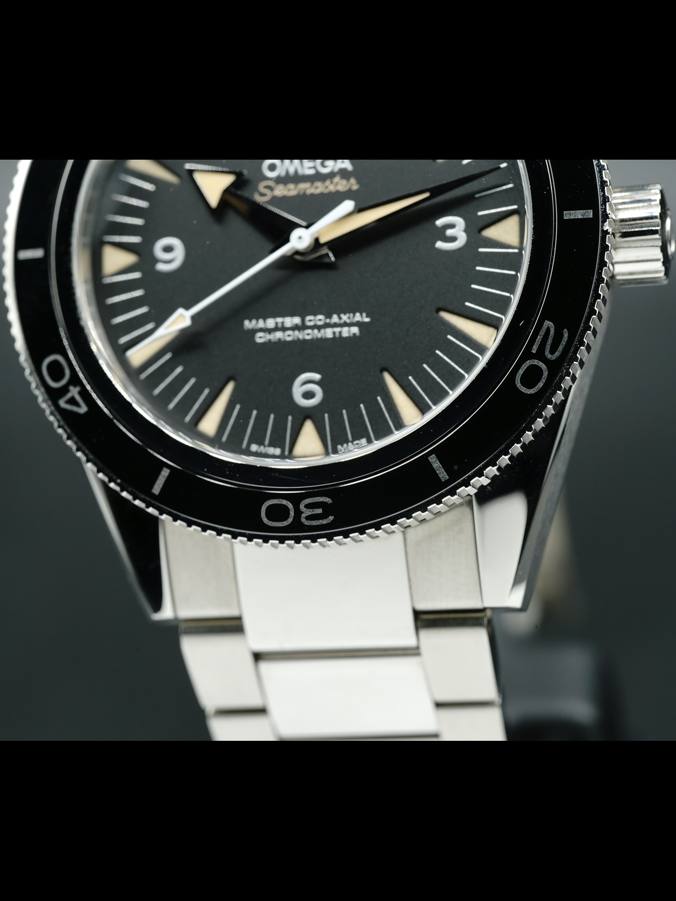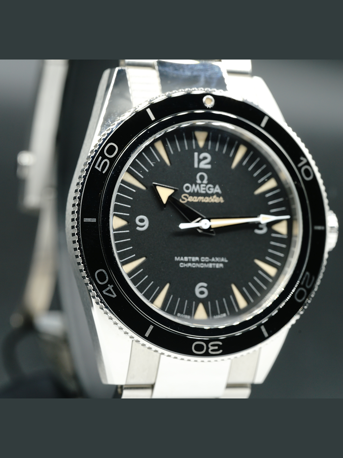 This Omega Seamaster 300 Steel Chronometer 41mm is in FANTASTIC condition. This seamaster 300 has a sand-blasted black dial with rhodium-plated hands coated with "vintage" Super-LumiNova. The polished ceramic bezel ring has a Liquidmetal diving scale. This watch includes its original box, papers, and international warranty dated for august 2020.