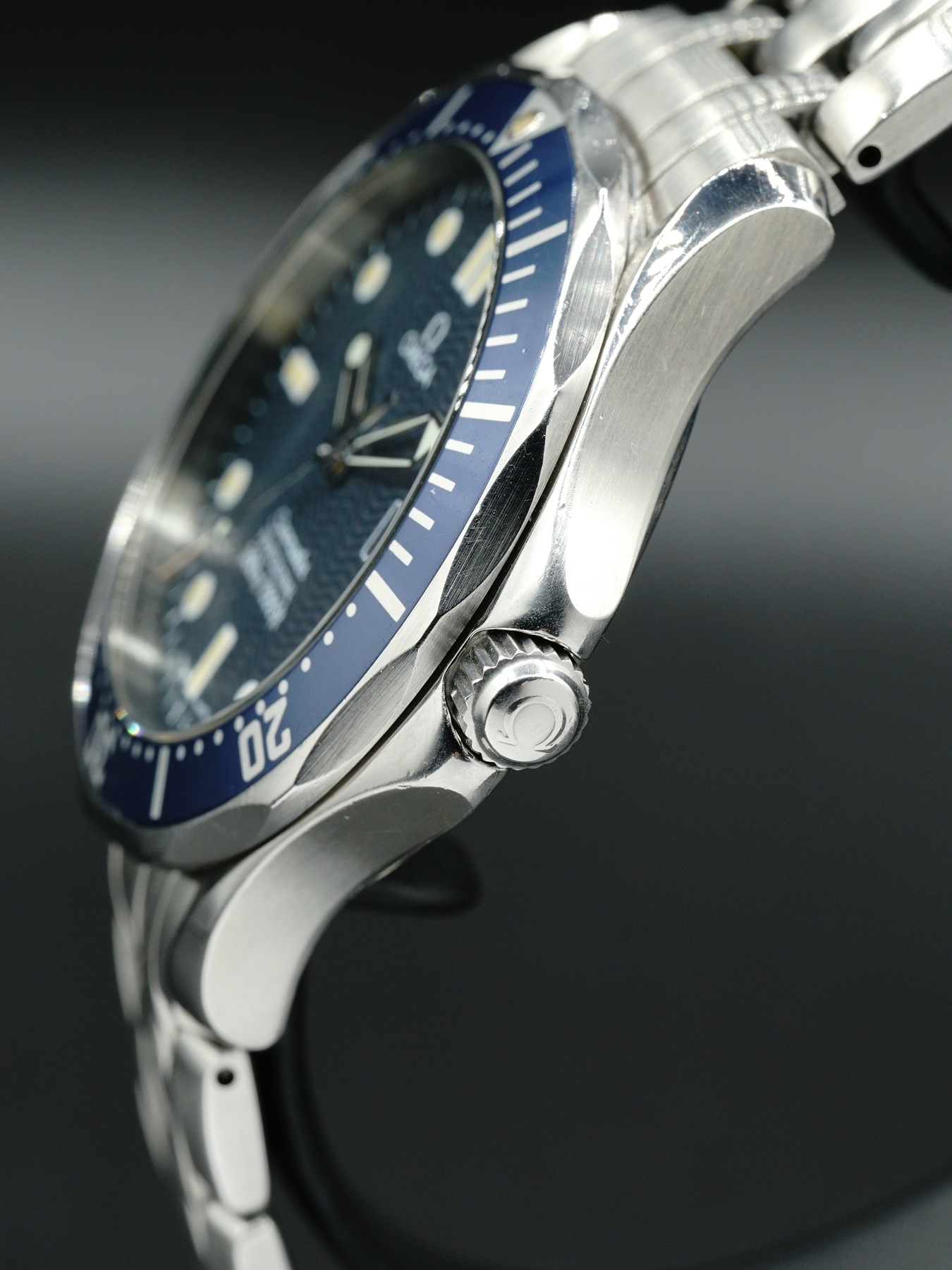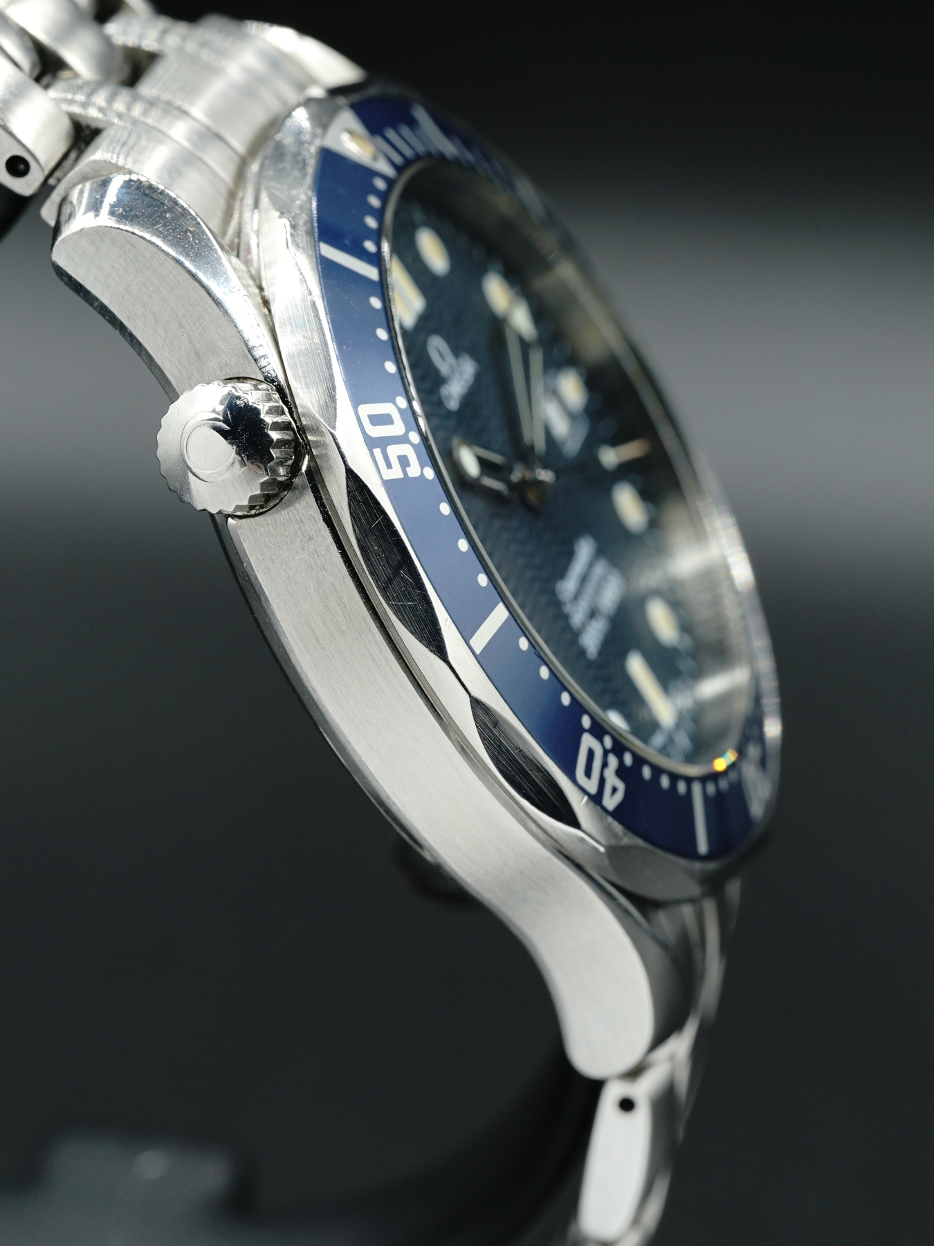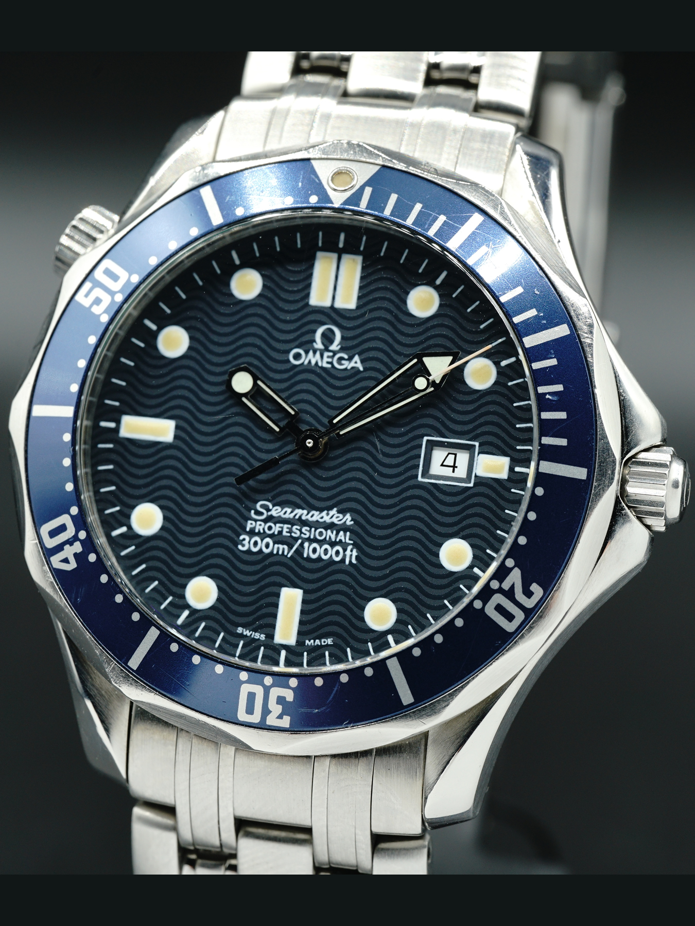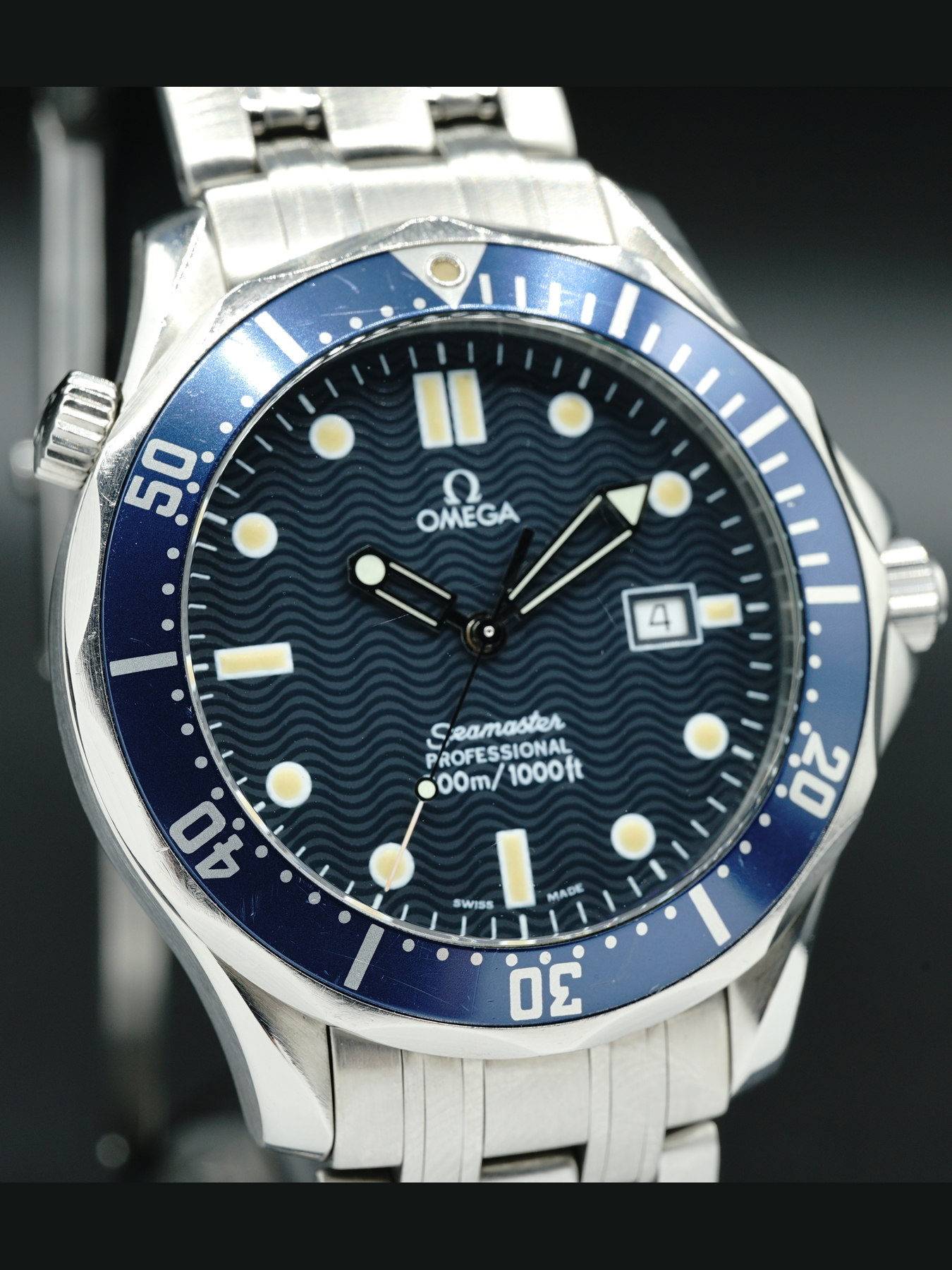 This Omega Seamaster 300m Quartz is in GREAT condition. This watch features a 41mm stainless steel case surrounding a blue wave dial on a stainless steel bracelet with folding.