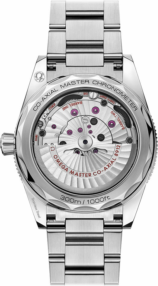 Presented on a brown leather strap, this timepiece includes a transparent sapphire crystal caseback, enabling a clear view of the OMEGA Co-Axial Master Chronometer Calibre 8912.