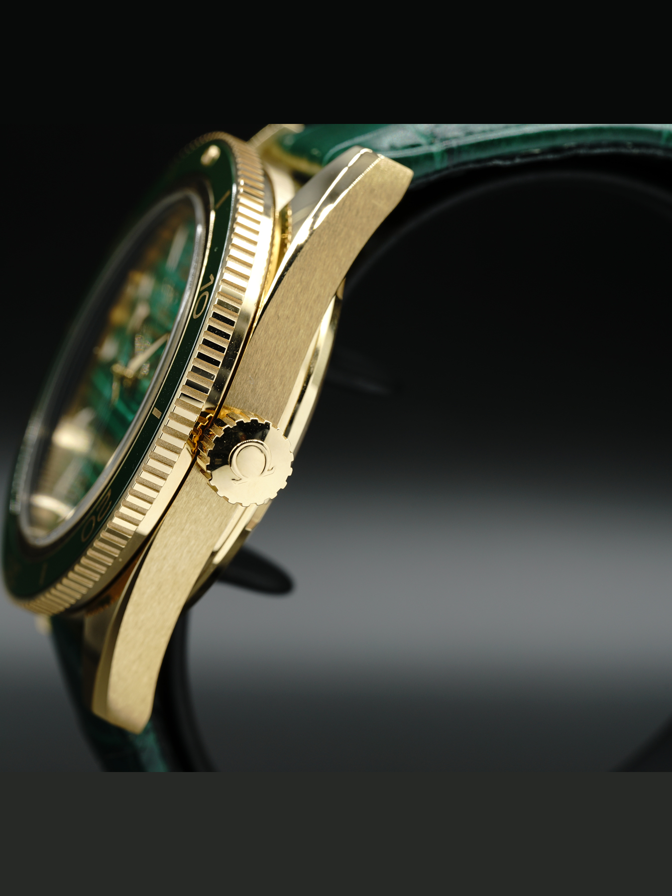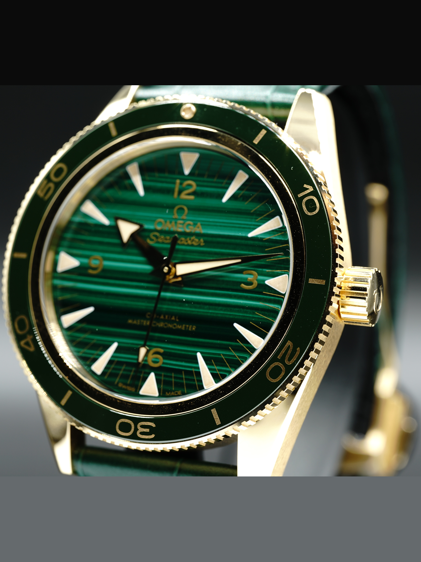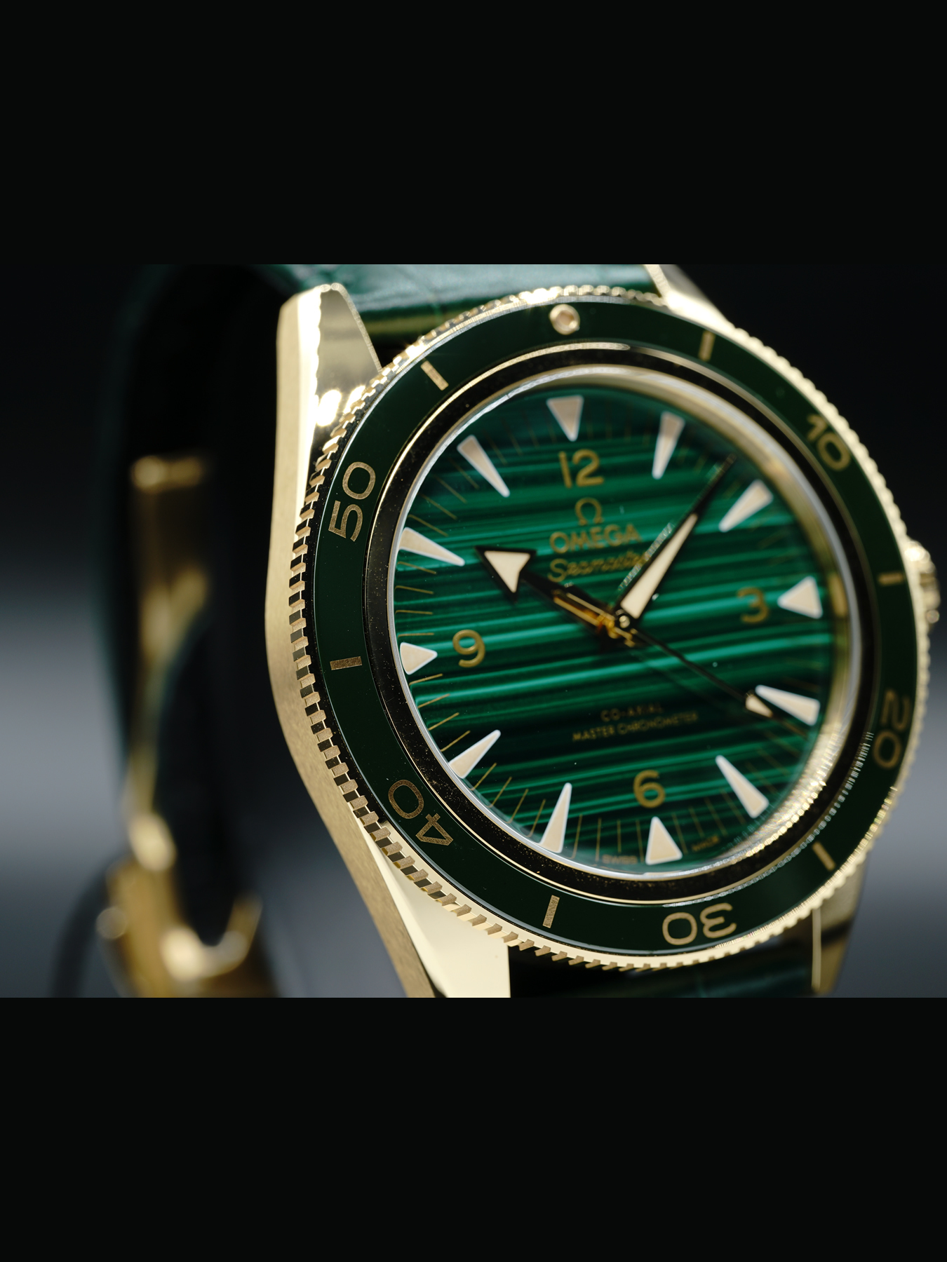 The Omega Seamaster 300 Co-Axial Master Chronometer sports a 41 mm case that is made of 18k yellow gold and features a green ceramic bezel with an OMEGA Ceragold diving scale. The most captivating of all is the watch's deep green dial, which is made of the precious stone malachite. It includes 18k yellow gold hands that are filled with Super-LumiNova. This watch is in GREAT condition and includes its original box, papers, and international warranty dated for December of 2020.