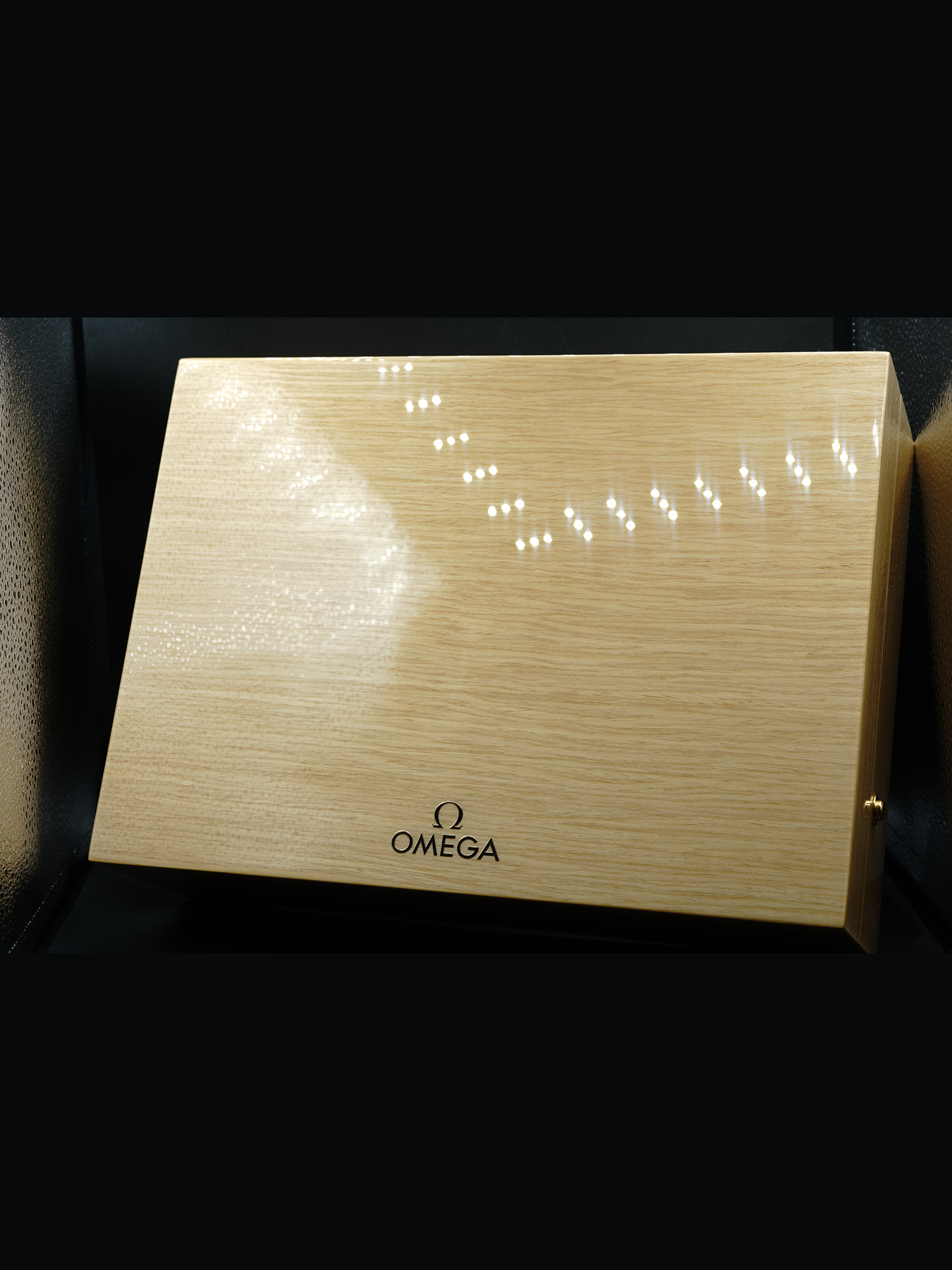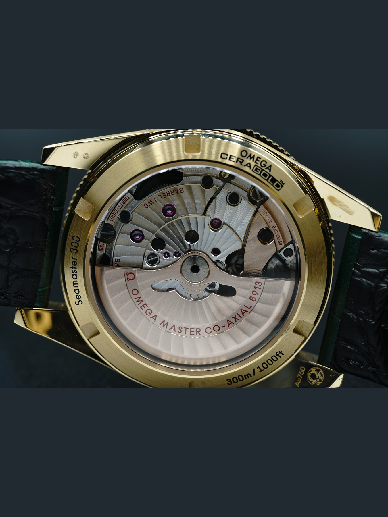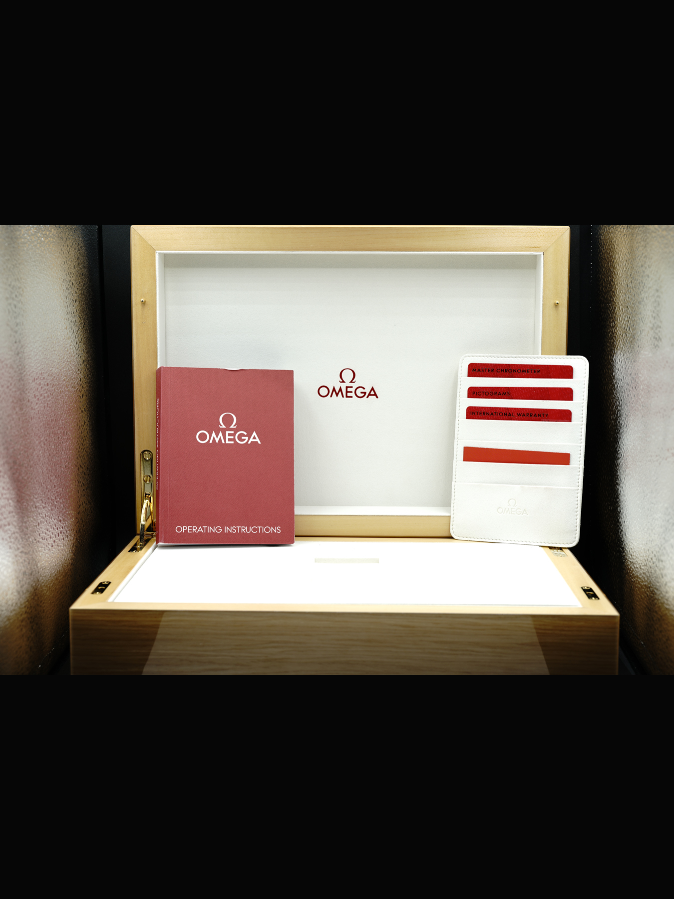 The Omega Seamaster 300 Co-Axial Master Chronometer sports a 41 mm case that is made of 18k yellow gold and features a green ceramic bezel with an OMEGA Ceragold diving scale. The most captivating of all is the watch's deep green dial, which is made of the precious stone malachite. It includes 18k yellow gold hands that are filled with Super-LumiNova. This watch is in GREAT condition and includes its original box, papers, and international warranty dated for December of 2020.