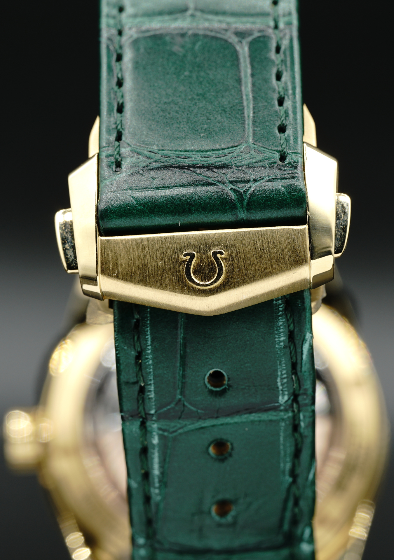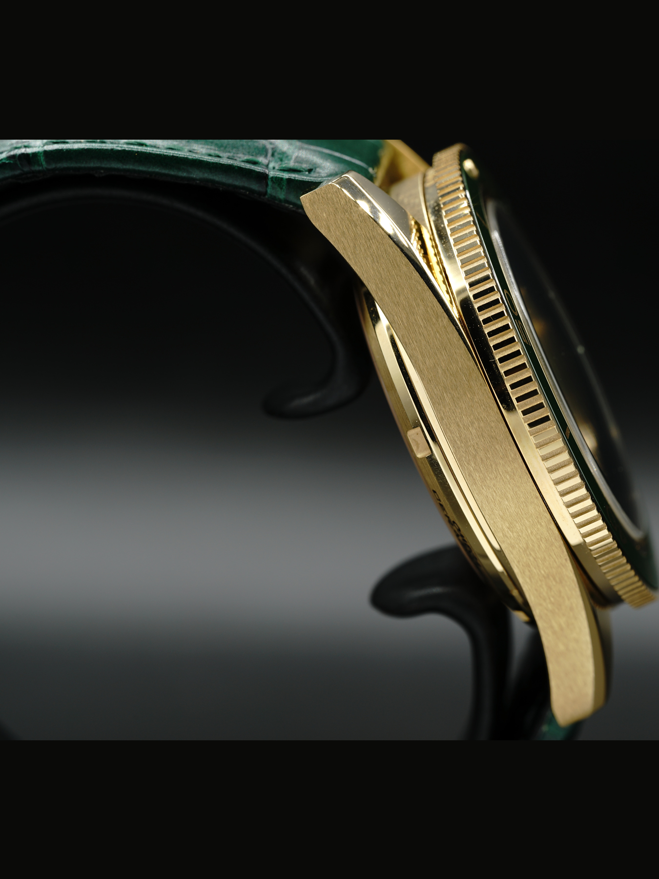 - This timepiece features a 41mm gold case paired with a high quality leather strap. It showcases a distinctive green dial and is powered by a precise automatic winding movement. The watch is designed with a water resistance of up to 300m.