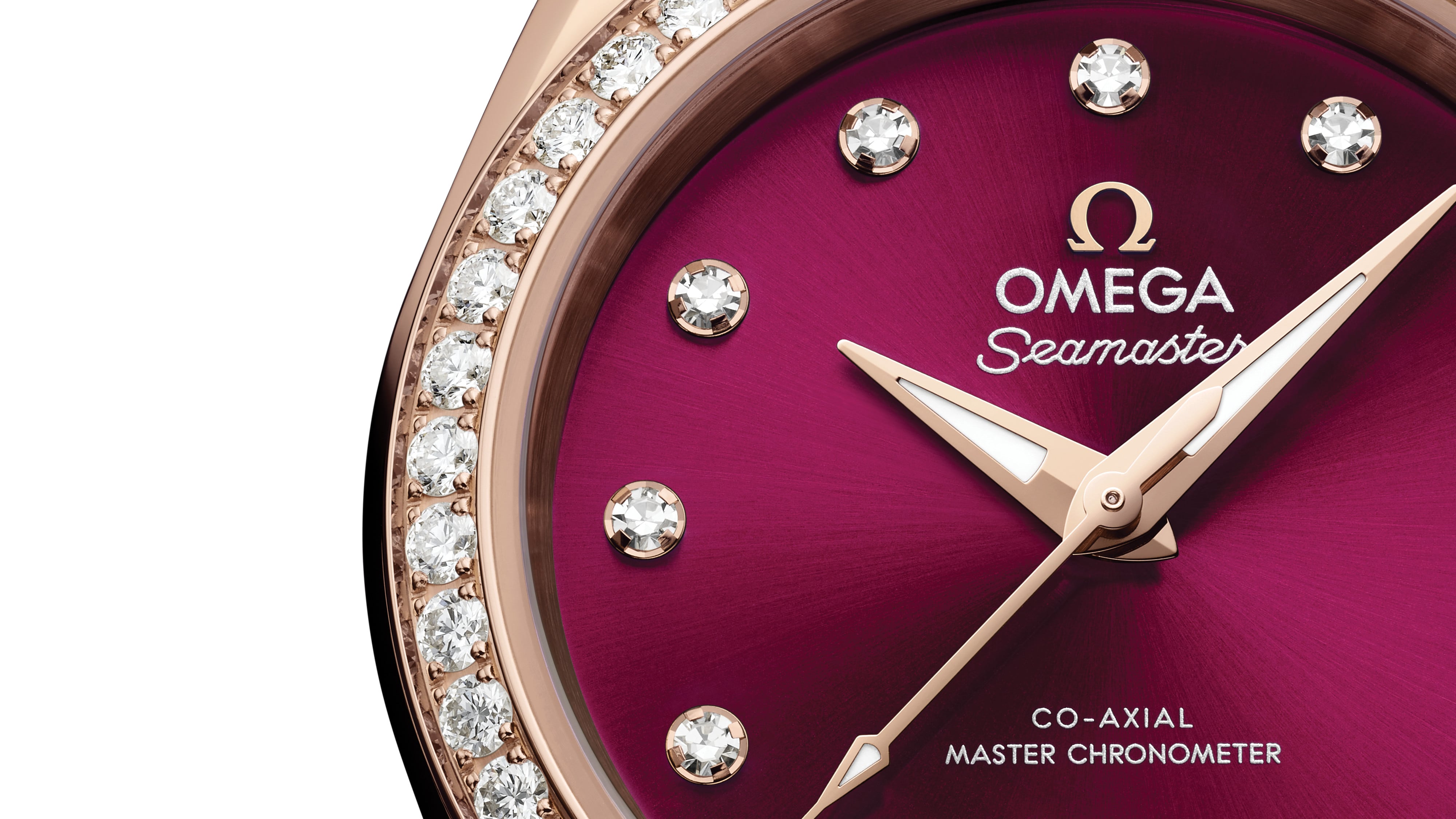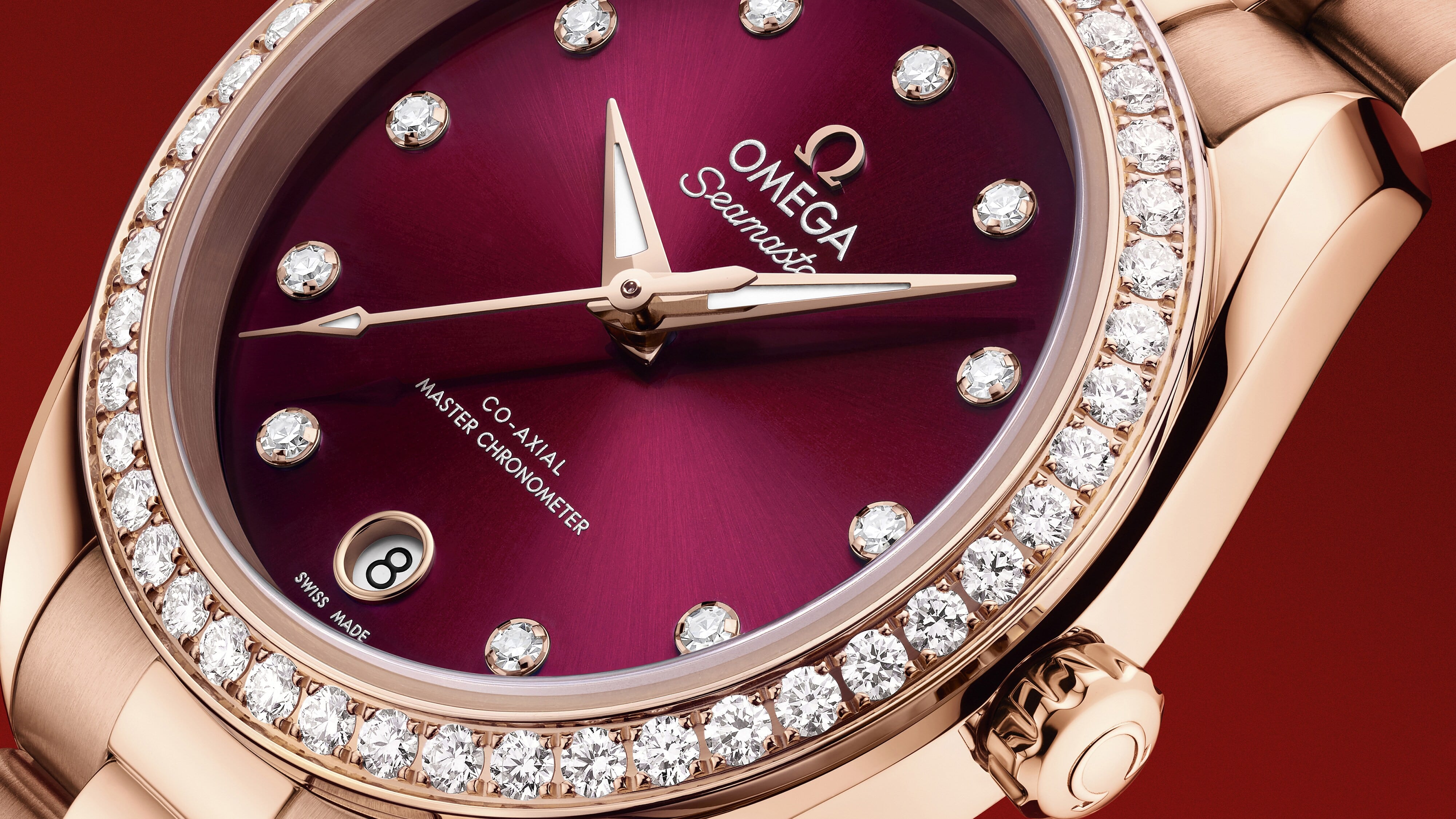 The burgundy dial is sun-brushed and coloured with tinted lacquer, with a circular date window at 6 o’clock. It is highlighted by 11 diamond hour-markers and redesigned faceted hands, with the minute hand tapering to a delicate point. All the applied elements and hands are in 18K Sedna™ Gold, while the hands are also filled with white Super-LumiNova which emits a blue glow.