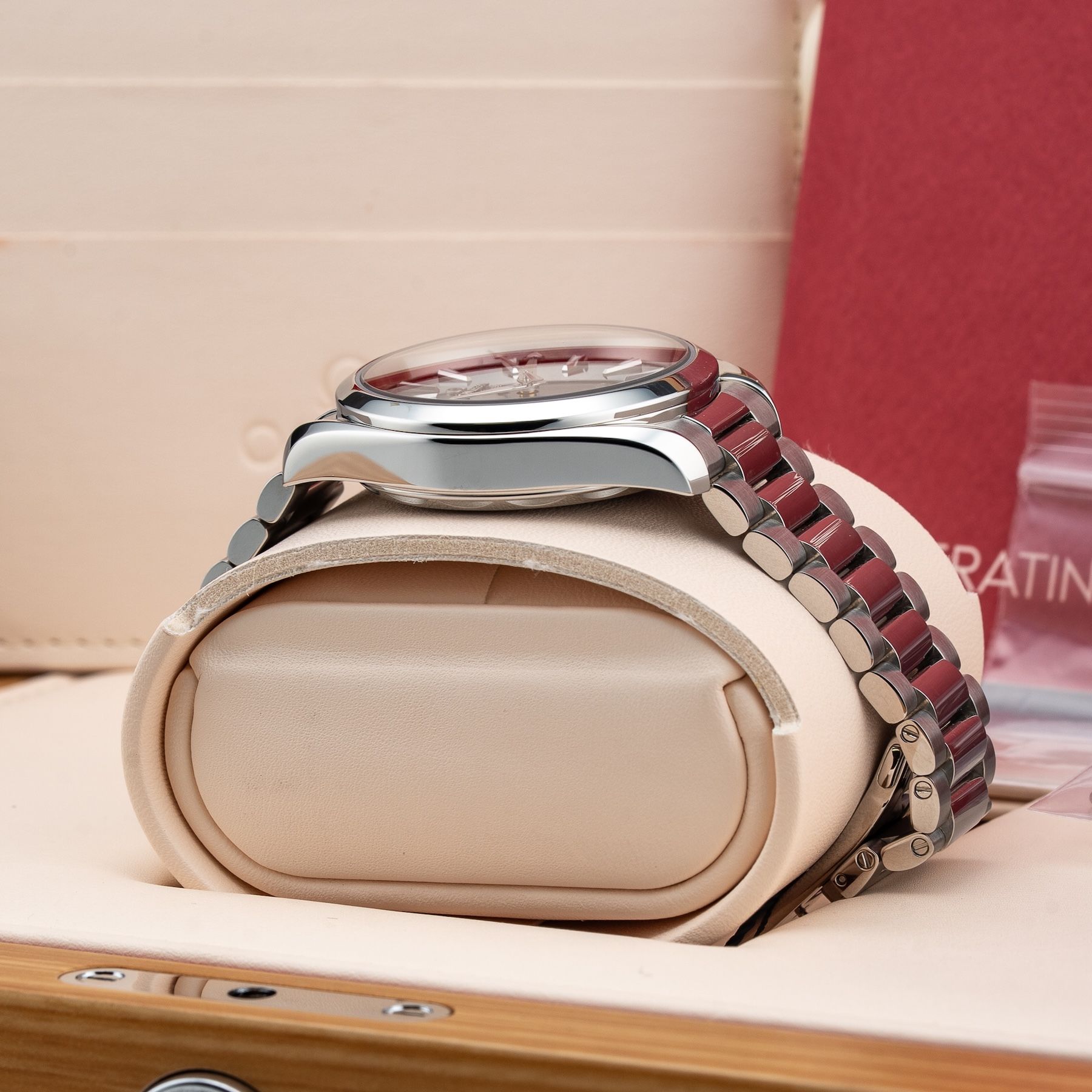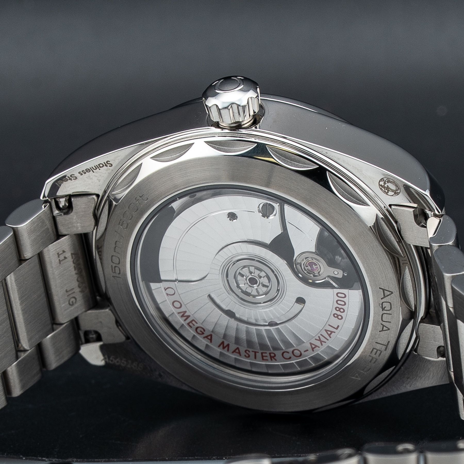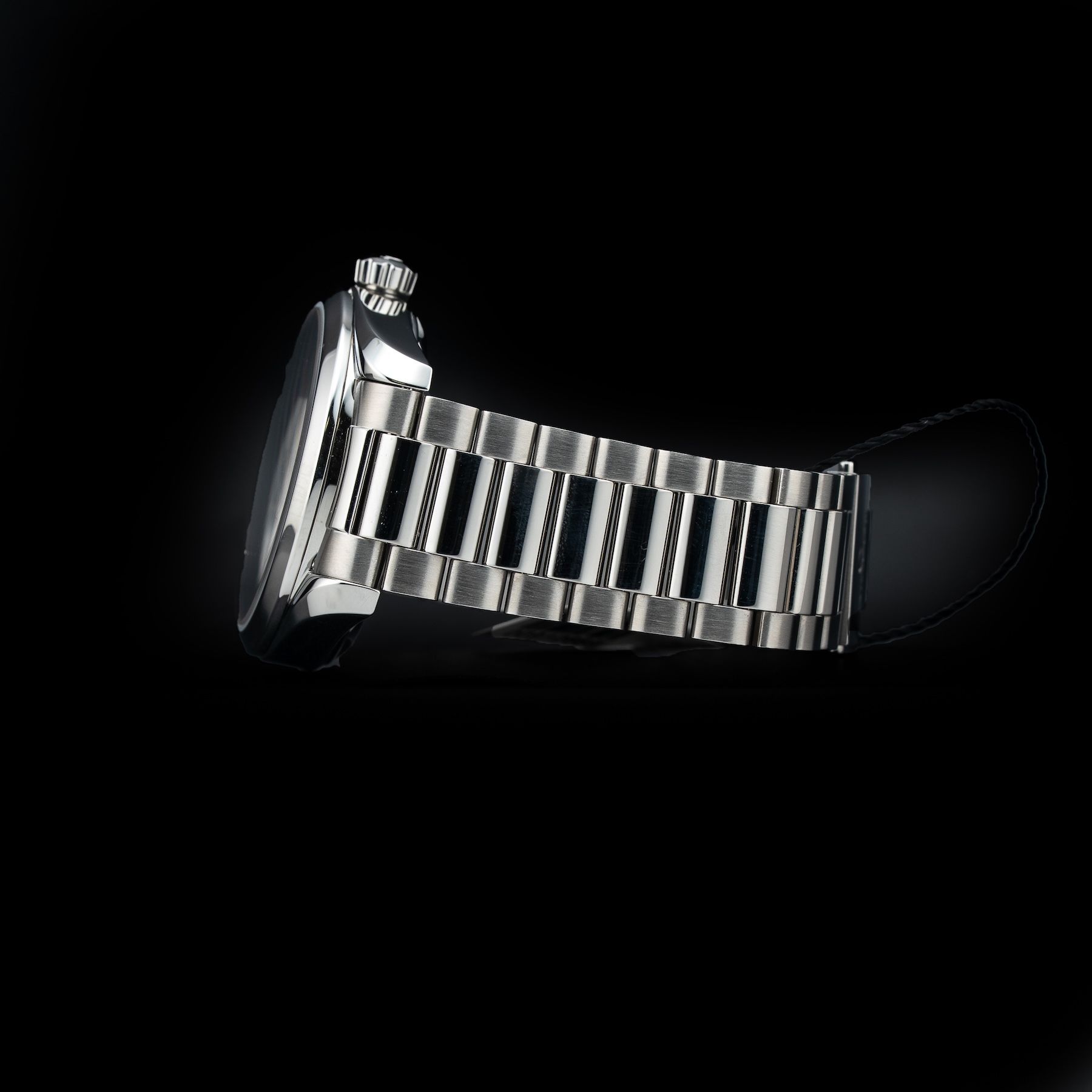 This watch features a 38mm stainless steel case on stainless steel bracelet. This watch also sports a black dial. Powered by a self-winding movement. Water resistance up to 150 meters.
