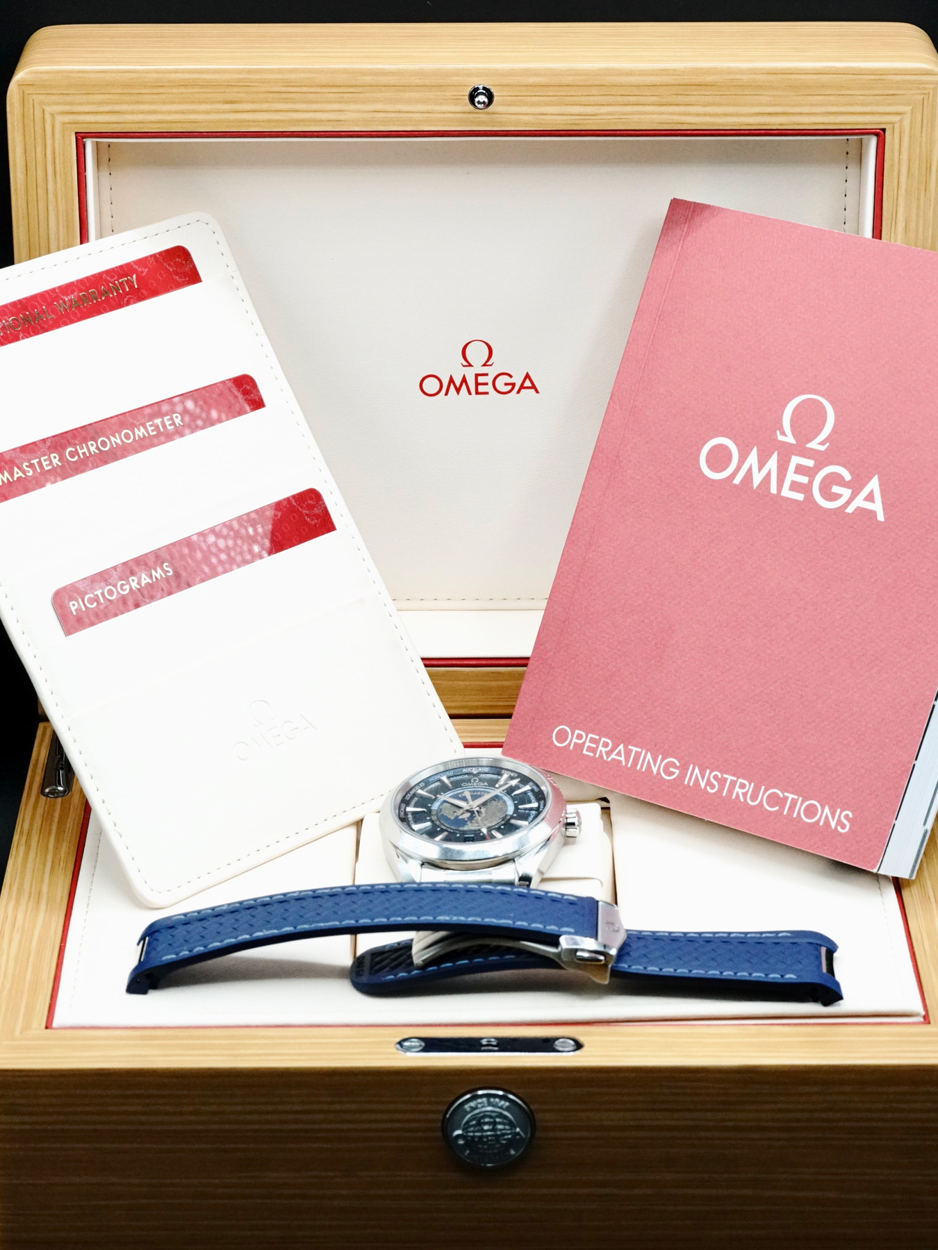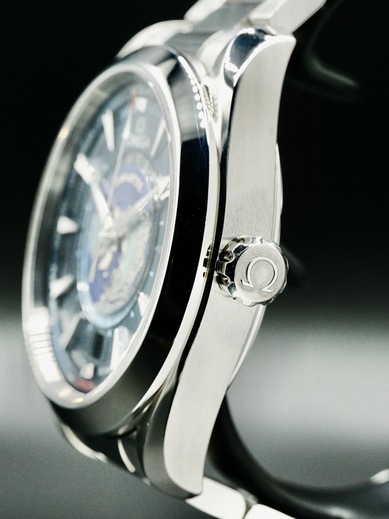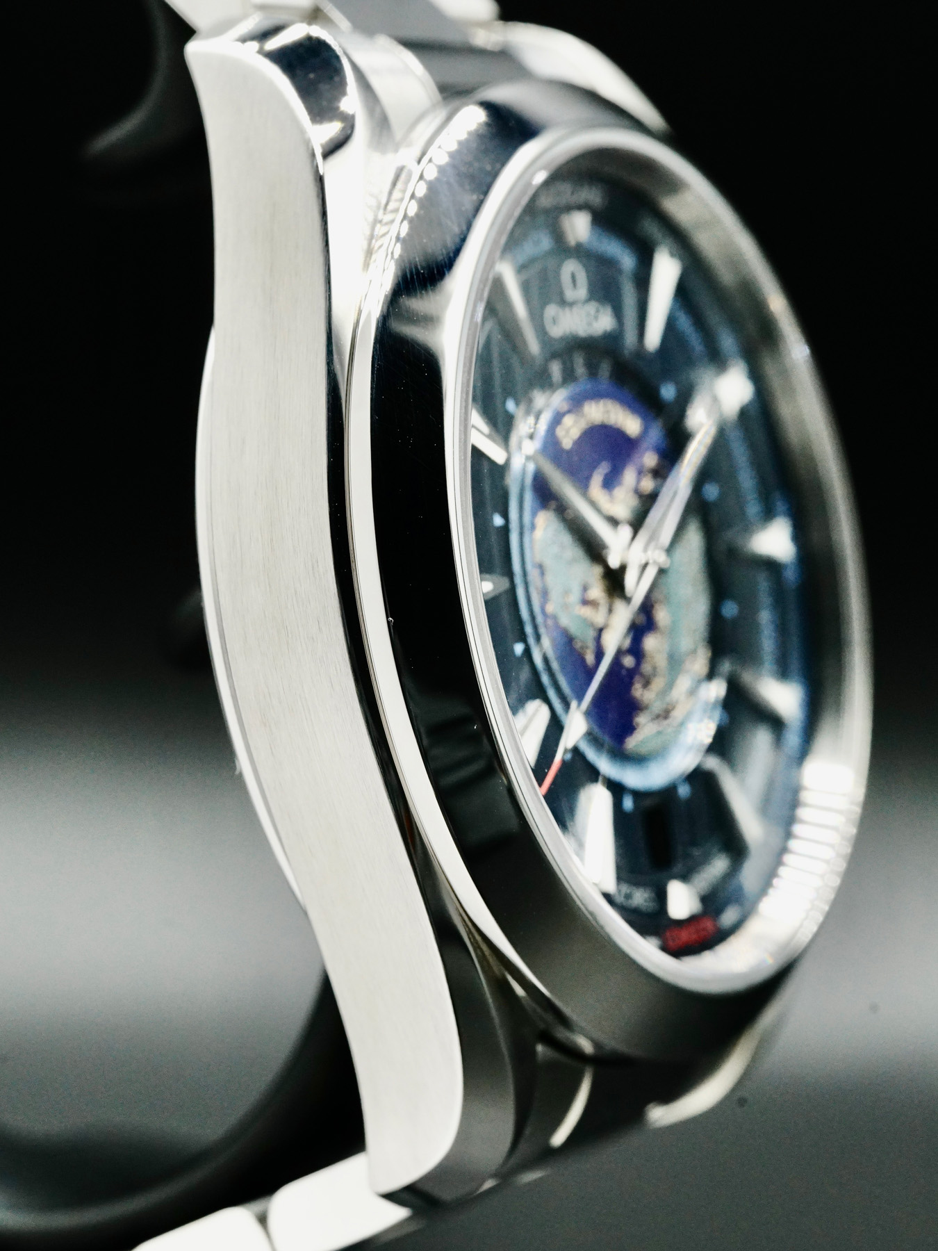 This Omega Seamaster Aqua Terra 150m GMT World Timer is in EXCELLENT condition. This watch includes its Original Box, Original Papers, Warranty Card Dated January 2023. Extra blue rubber strap. This watch has been fully authenticated and certified by Exquisite Timepieces.