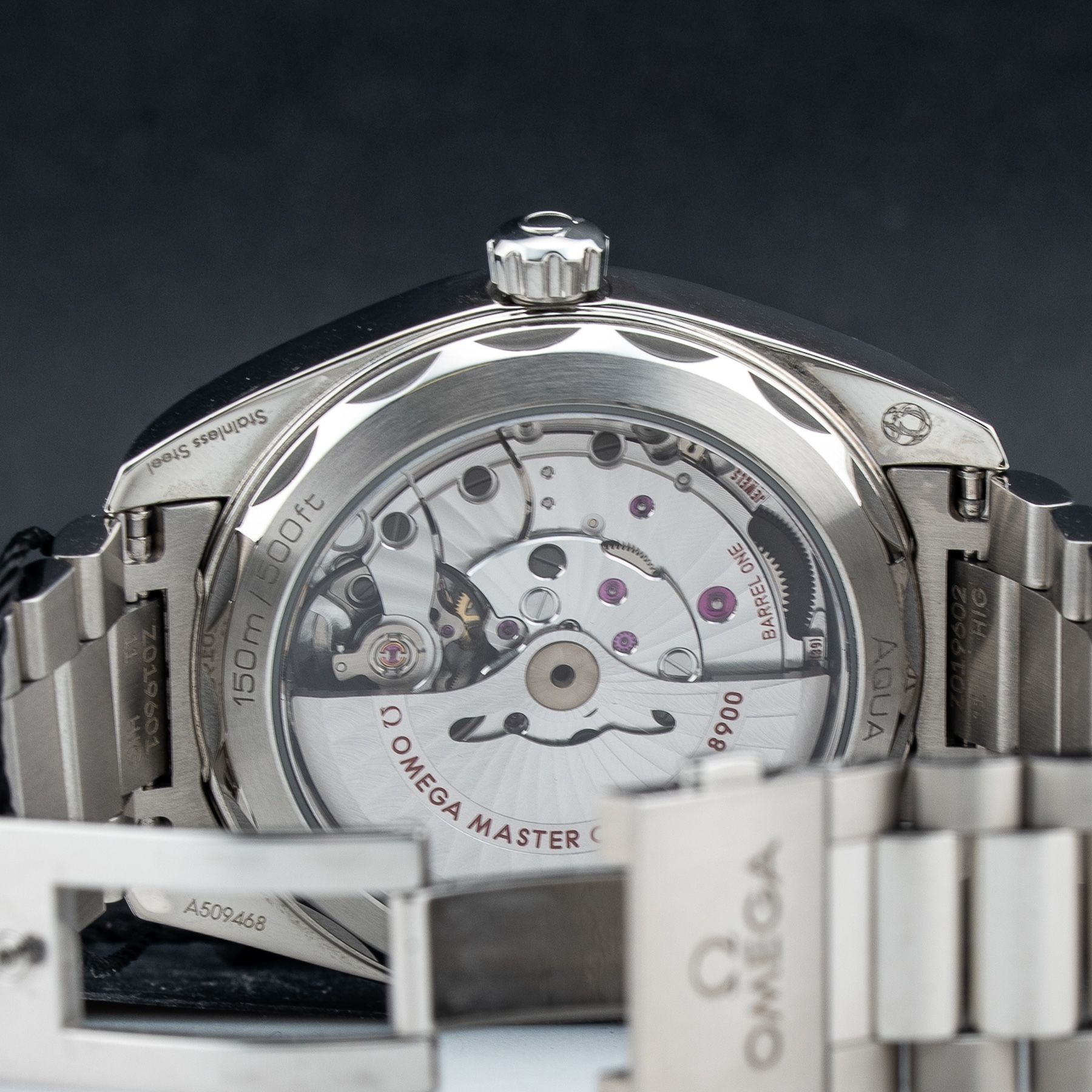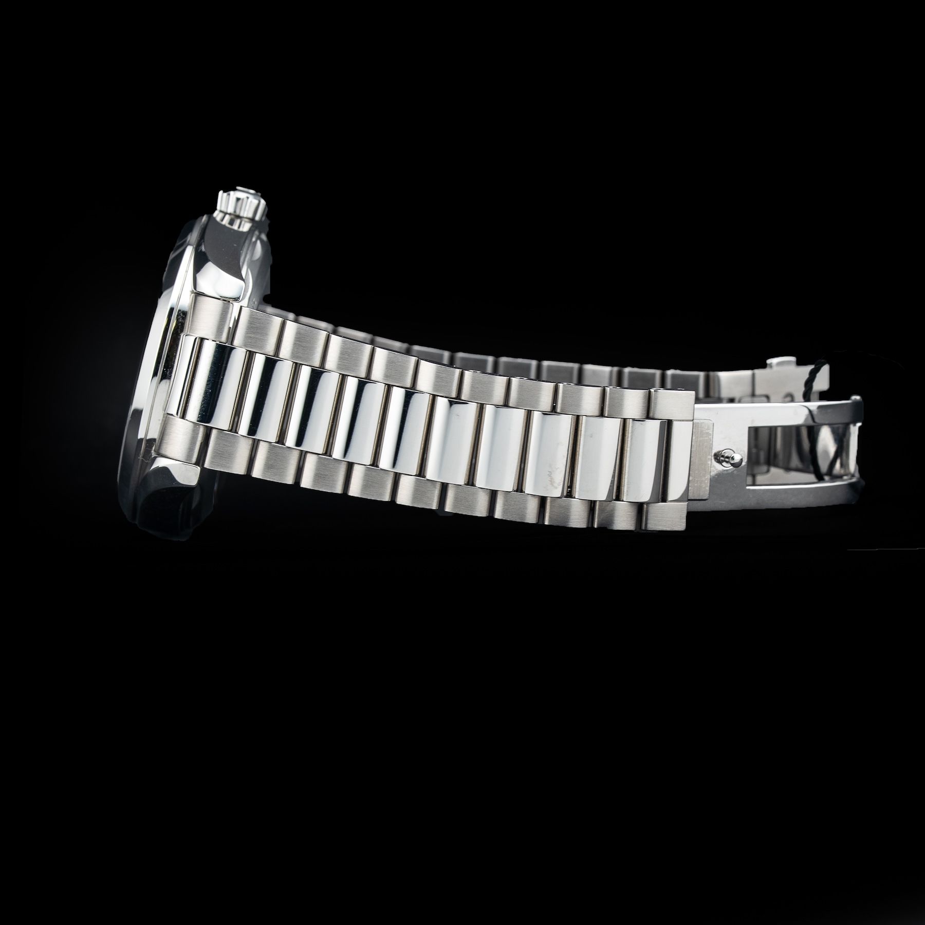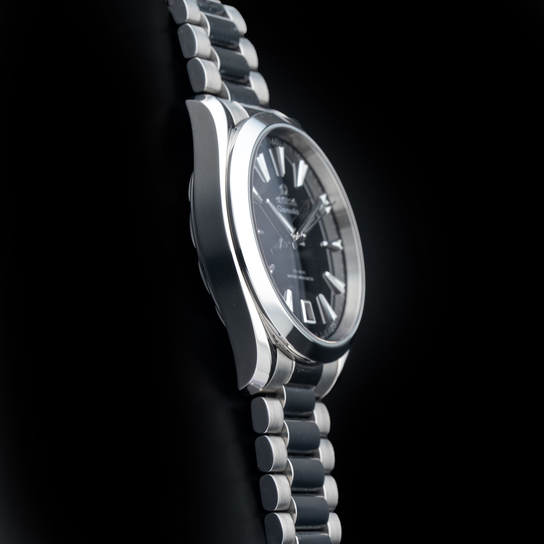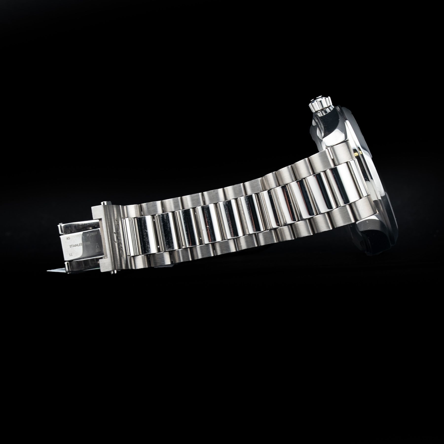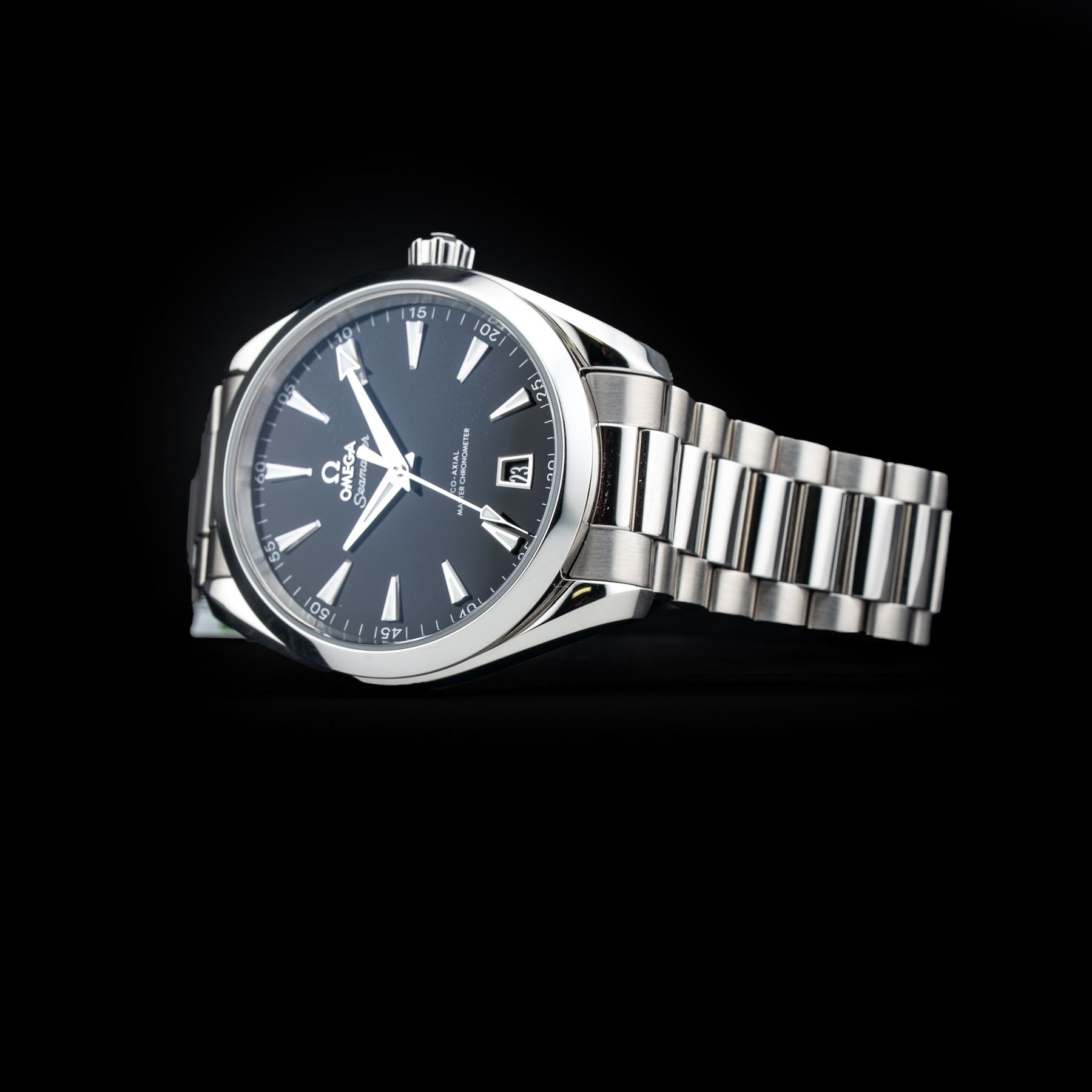 This watch features a 41mm stainless steel case on stainless steel bracelet. This watch also sports a black dial. Powered by a self-winding movement. Water resistance up to 150 meters.