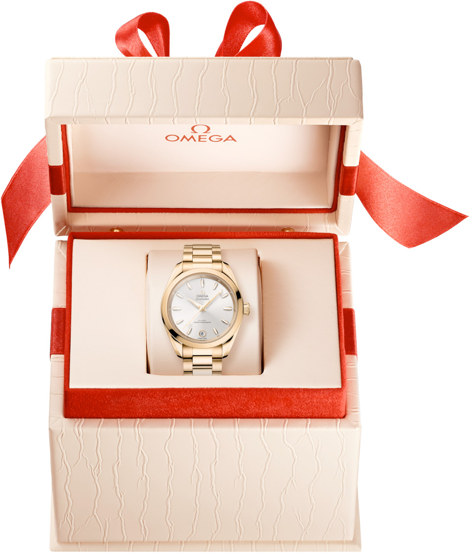 This 34 mm model, crafted in polished 18K Moonshine™ Gold, has a conical crown and wave-edged caseback with flat sapphire crystal. The sun-brushed and lacquered silvery dial features a circular date window at 6 o’clock ringed in 18K Moonshine™ Gold. OMEGA has also used 18K Moonshine™ Gold for the facetted hands and distinctive hour-markers, which are shaped like sailboat hulls and filled with white Super-LumiNova.