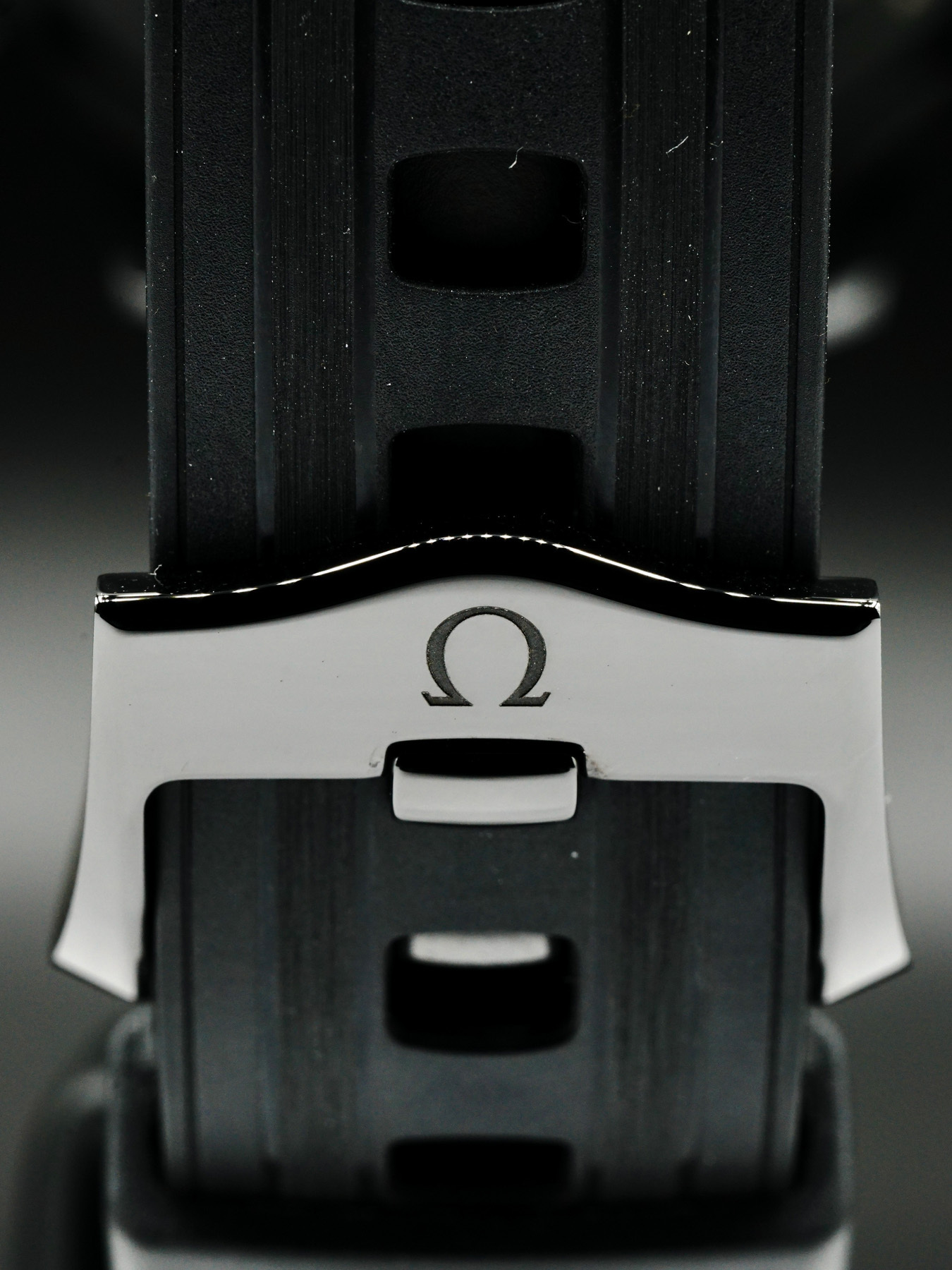 This Omega Seamaster Diver 300 features a 43.5mm black ceramic case with a display case back on a black rubber strap. This watch also sports a black dial with luminous hands and index dial markers covered by scratch resistant sapphire crystal.