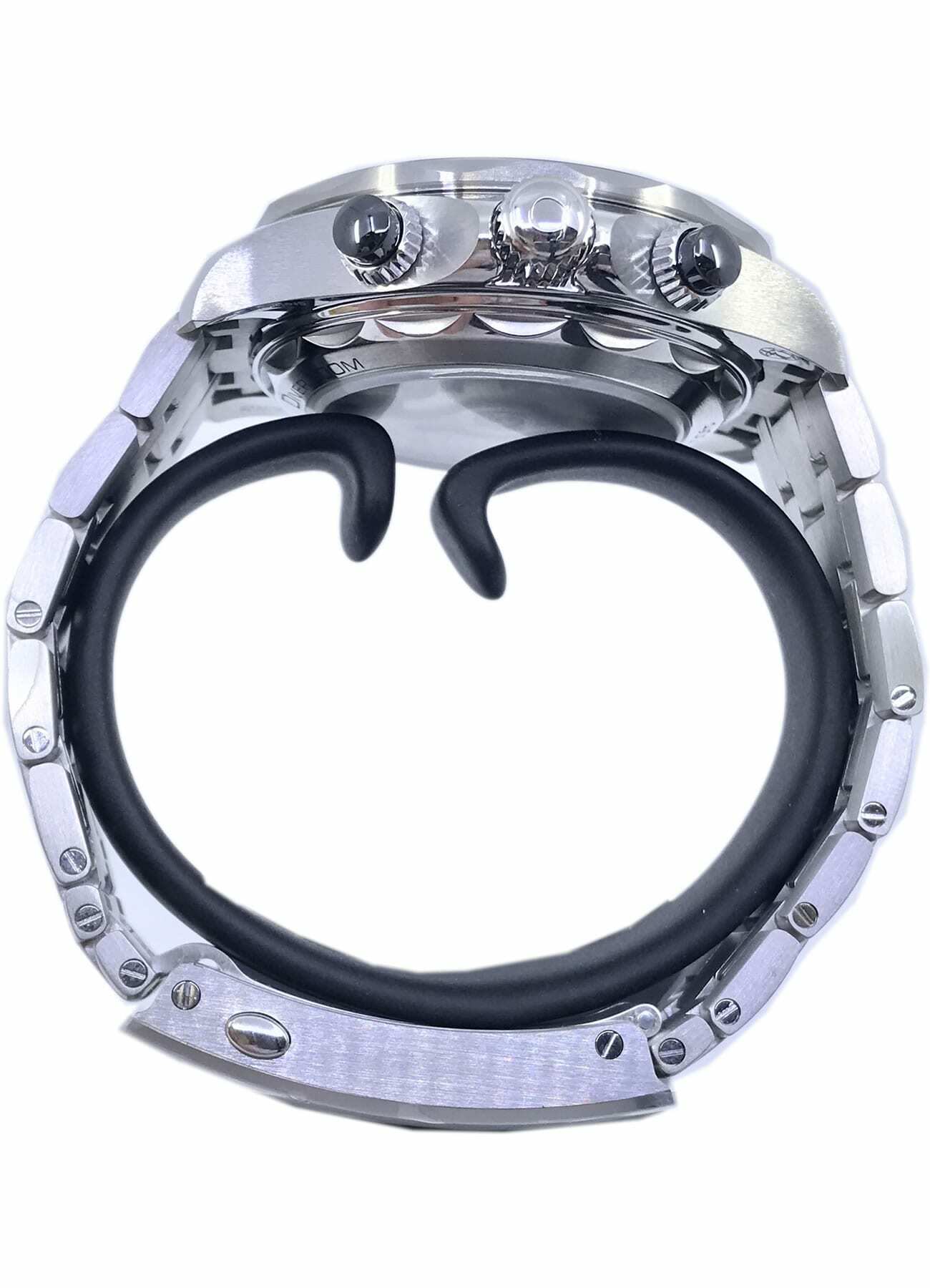 - This timepiece features a 44mm steel case paired with a high quality steel bracelet. It showcases a distinctive black dial and is powered by a precise automatic winding movement. The watch is designed with a water resistance of up to 300m.