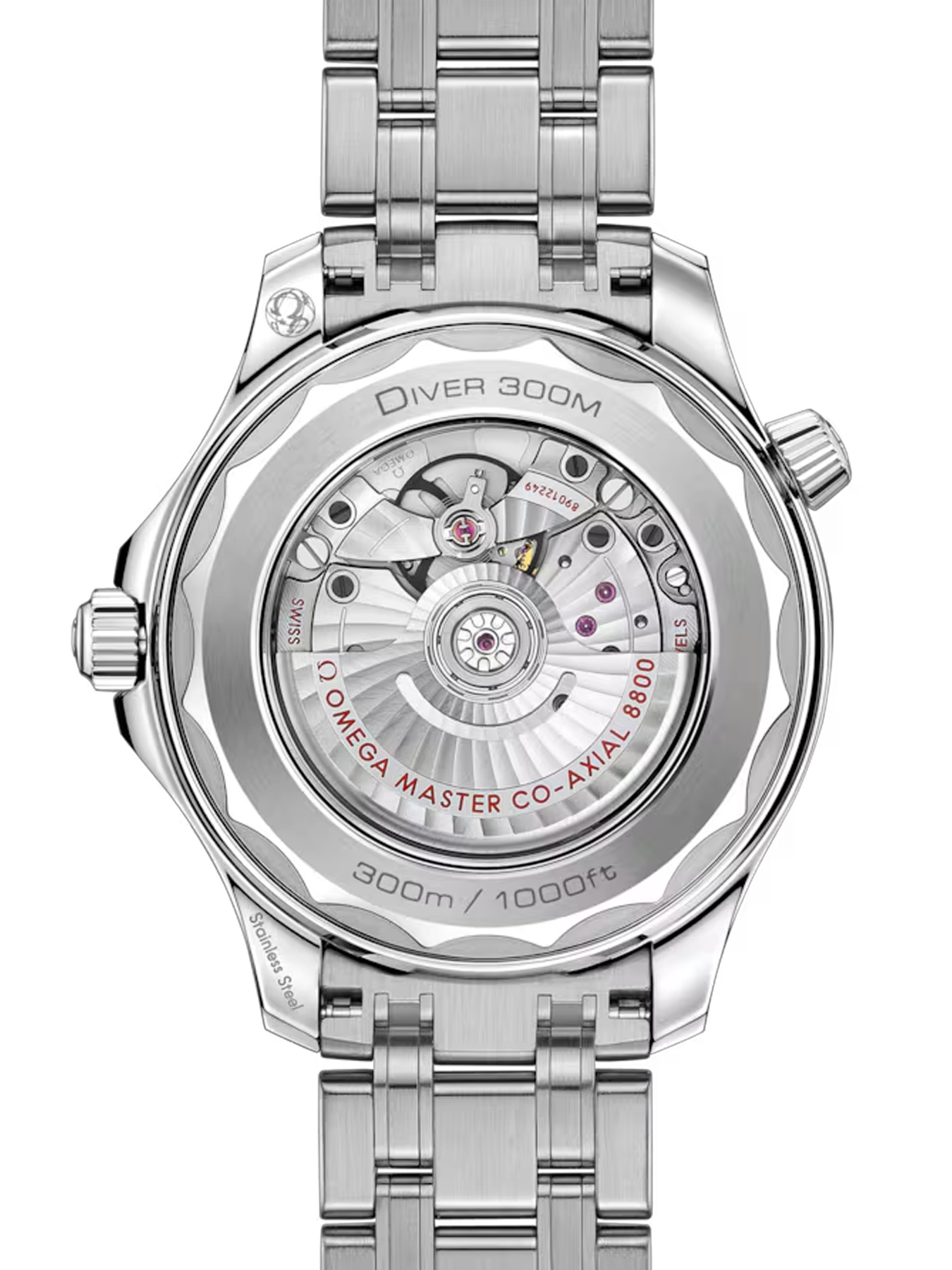 The watch is powered by Master Chronometer Calibre 8800, which can be seen from the watch's transparent wave etched case-back. It has a brilliant power reserve of 55 hours. As it is a diver's watch, the Seamaster Diver 300m 210.30.42.20.06.001 has exceptional water resistance. It can resist up to 300 meters or 1000 feet of underwater depth as well as pressure. The piece has helium valves to ensure no compromise in terms of the watch's functionality. It is anti-magnetic and has a date window along with self-winding features.