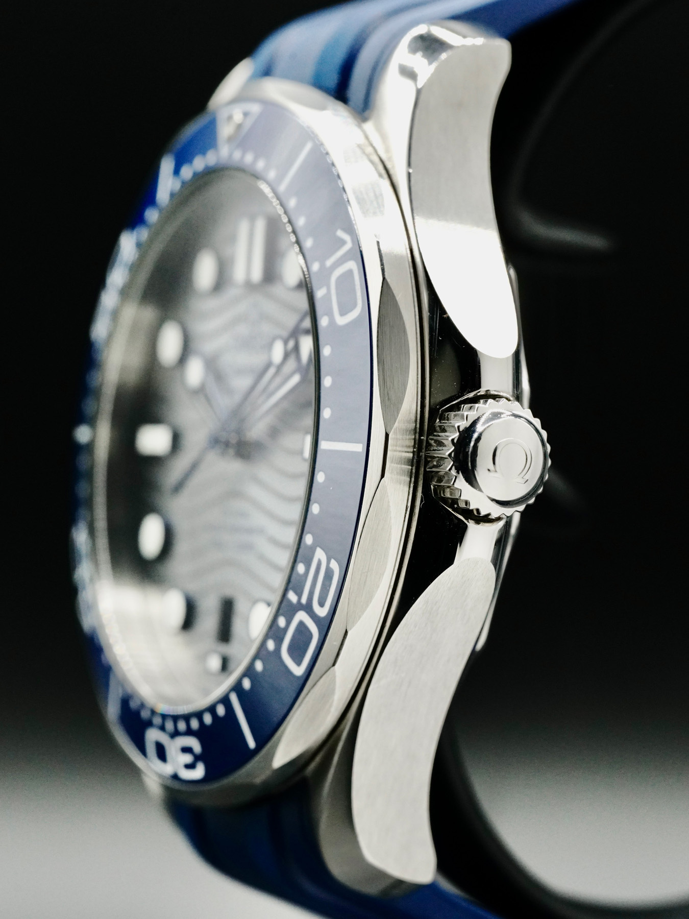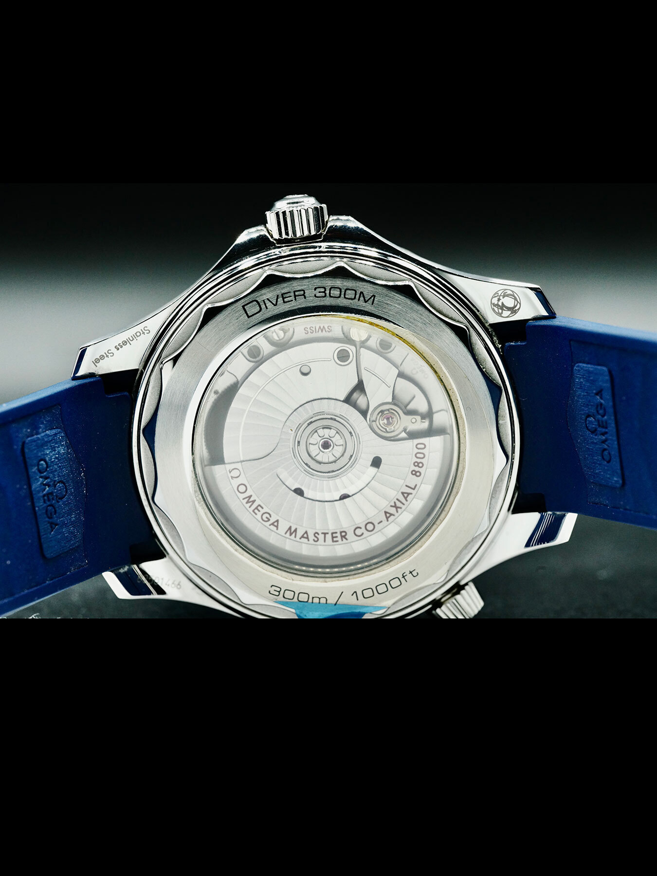 This Omega Diver 300M Co-Axial Master Chronometer features a 42mm stainless steel case with an exhibition case back on a blue rubber strap. This watch also sports a grey dial with luminous hands and index dial markers covered by scratch resistant sapphire crystal.