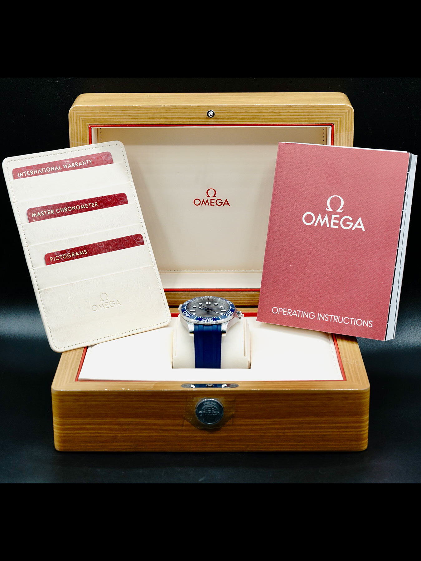 This Omega 210.32.42.20.06.001 Diver 300M Co-Axial Master Chronometer is in EXCELLENT condition. This watch includes its original box, operating instructions, and warranty card. No date on warranty card. This watch has been fully authenticated and certified by Exquisite Timepieces.