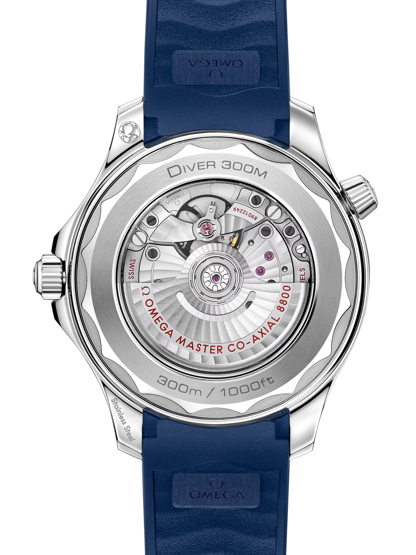 The Omega Seamaster Diver 300m 210.32.42.20.06.001 model has the OMEGA Master Chronometer Caliber 8800, and you can view the chronometer from the transparent back case of the watch. The chronometer of the model is Master Chronometer Certified. This certification means the model has the highest performance, magnetic resistance, and precision standards, which have been set by the Swiss Federal Institute of Metrology (METAS). The model has a high water resistance of 30 bar (300 meters / 1000 feet).