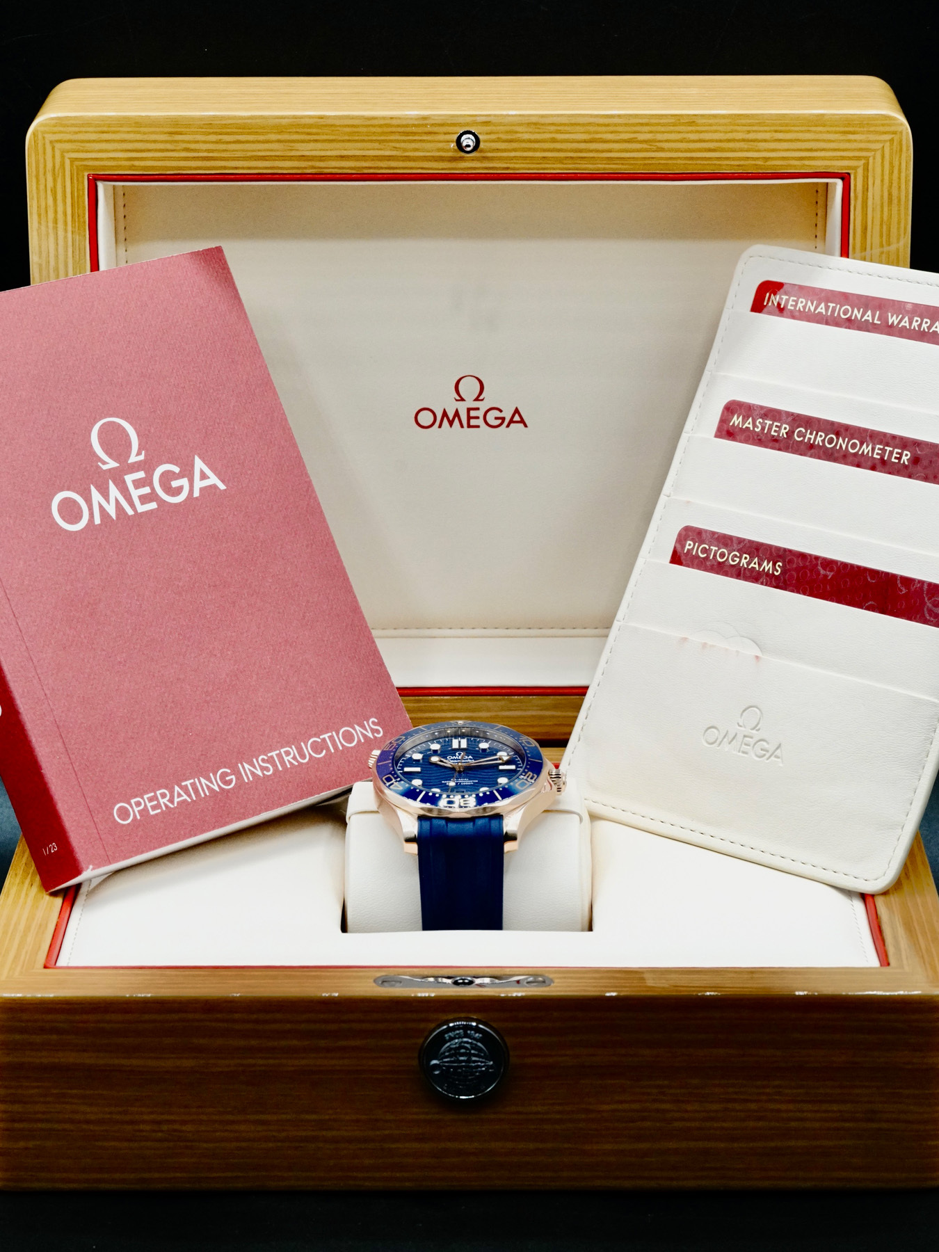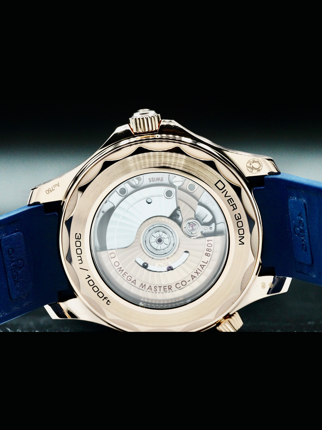 This Omega Seamaster Diver 300 Master Chronometer features a 42mm 18k Sedna Gold case with a display case back on a blue rubber strap. This watch also sports a blue dial with luminous hands and index dial markers covered by scratch resistant sapphire crystal.