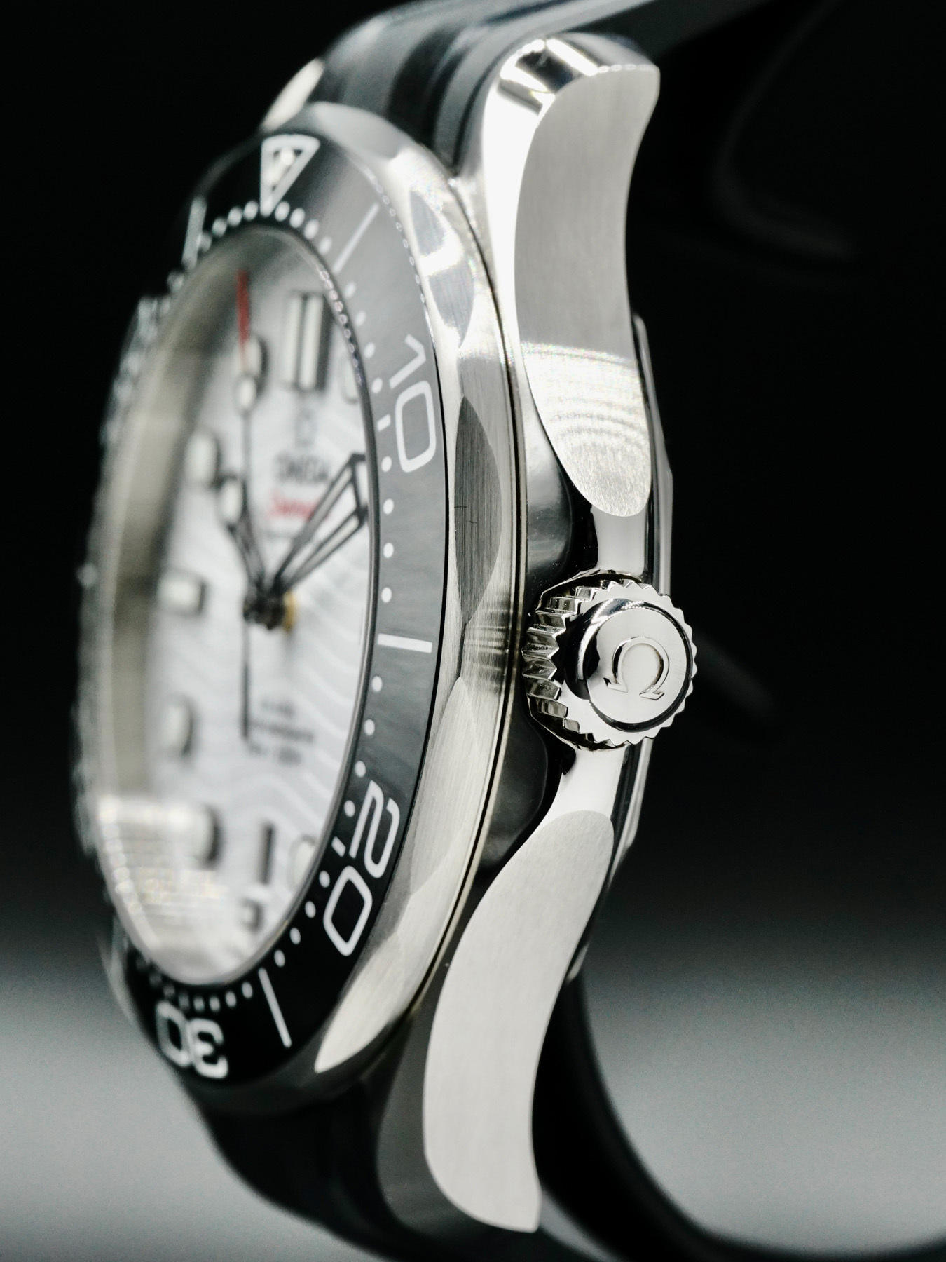 This Omega Seamaster Diver 300M 210.32.42.20.04.001 features a 42mm steel case on bracelet. This watch also sports a white dial.