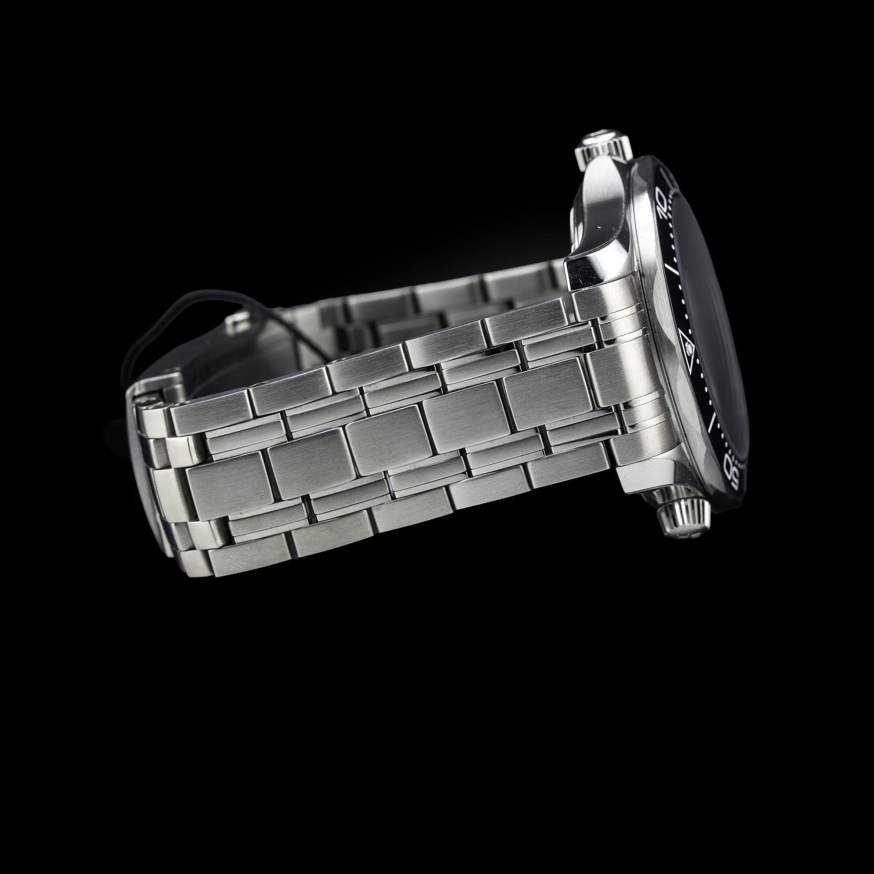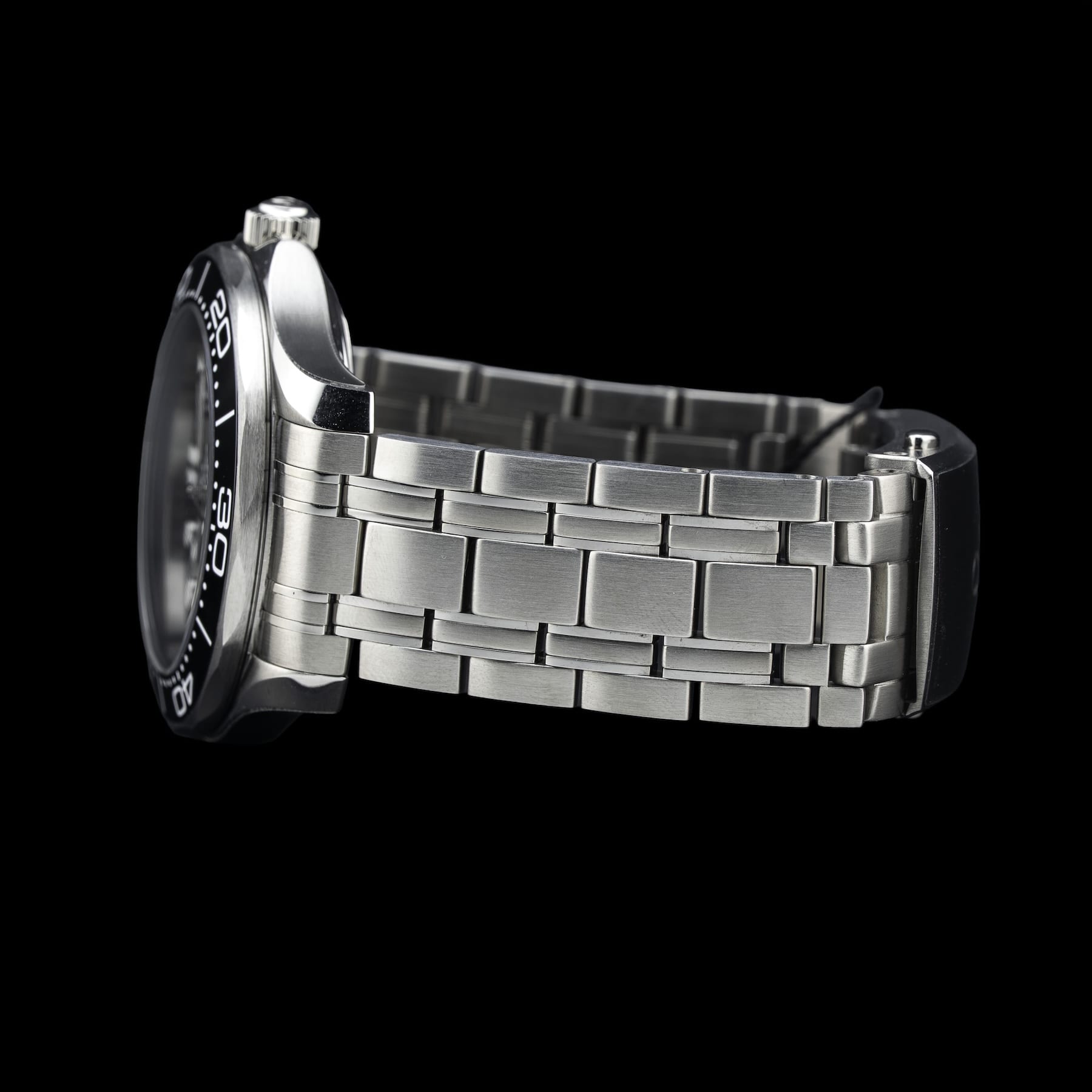 - This timepiece features a 42mm steel case paired with a high quality steel bracelet. It showcases a distinctive black dial and is powered by a precise automatic winding movement. The watch is designed with a water resistance of up to 300m.