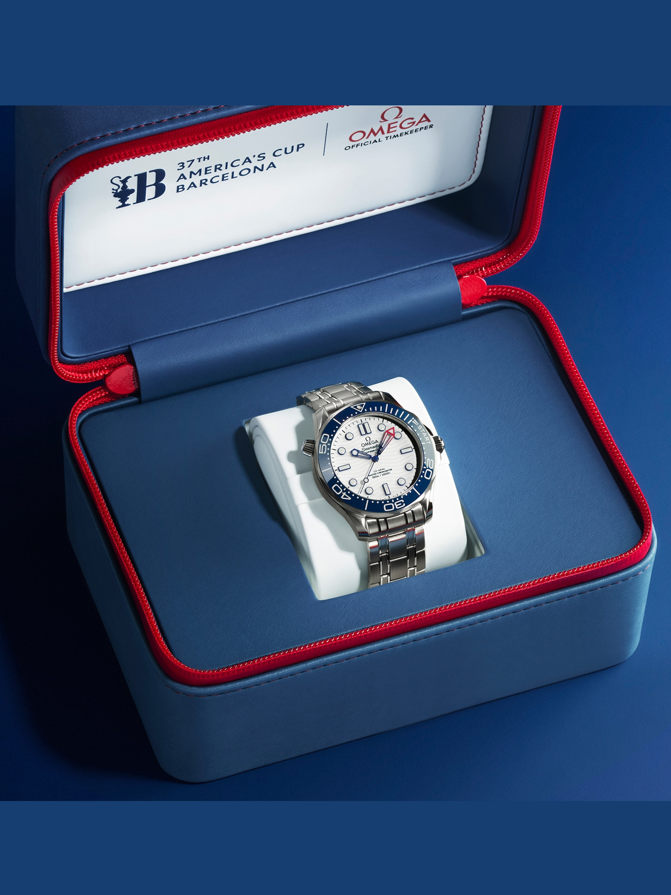This model has a stainless-steel bracelet with OMEGA’s patented Quick-Change system and is presented in a commemorative blue box with red stitching.