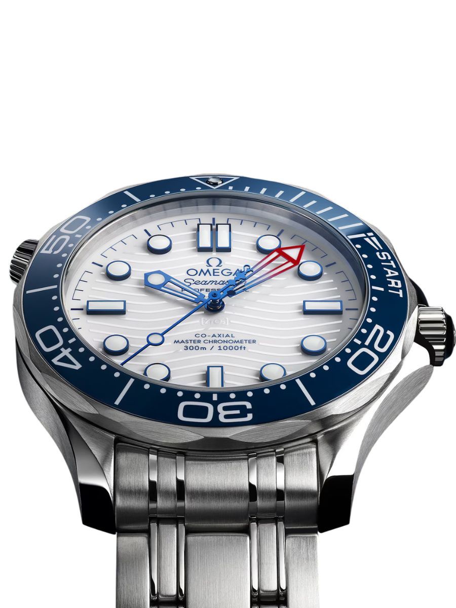 The 42 mm Seamaster Diver 300M in stainless steel has a blue ceramic unidirectional bezel with a regatta scale, comprised of two 5-minute pre-start sections, and START section with regatta-inspired flag.