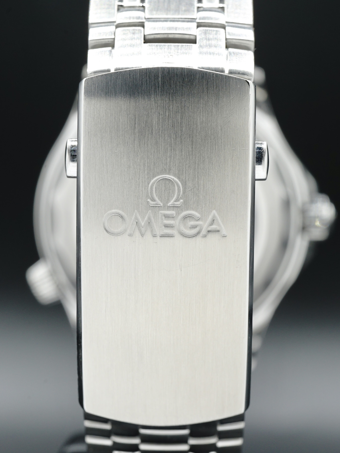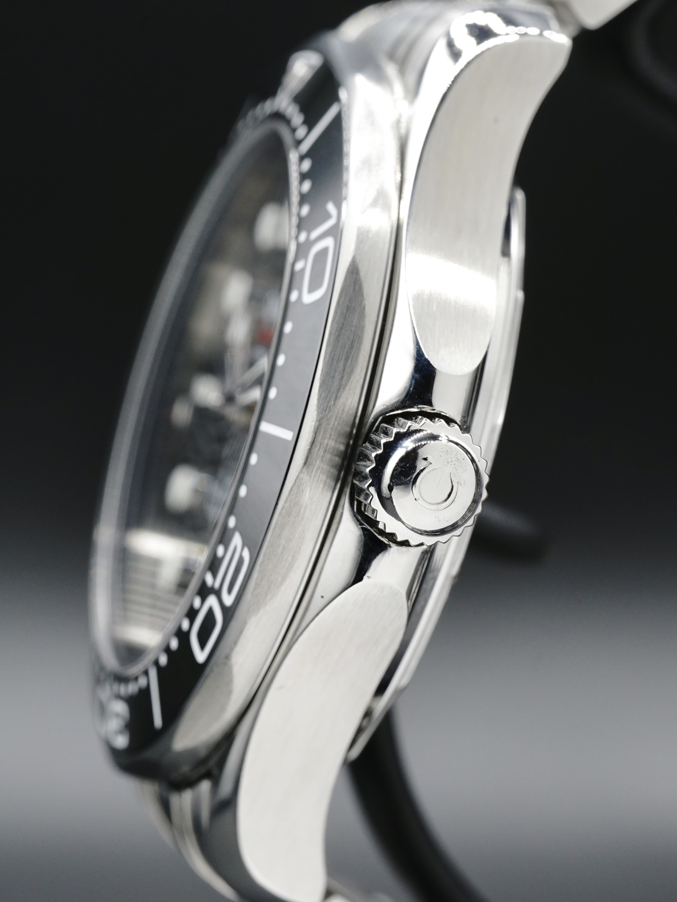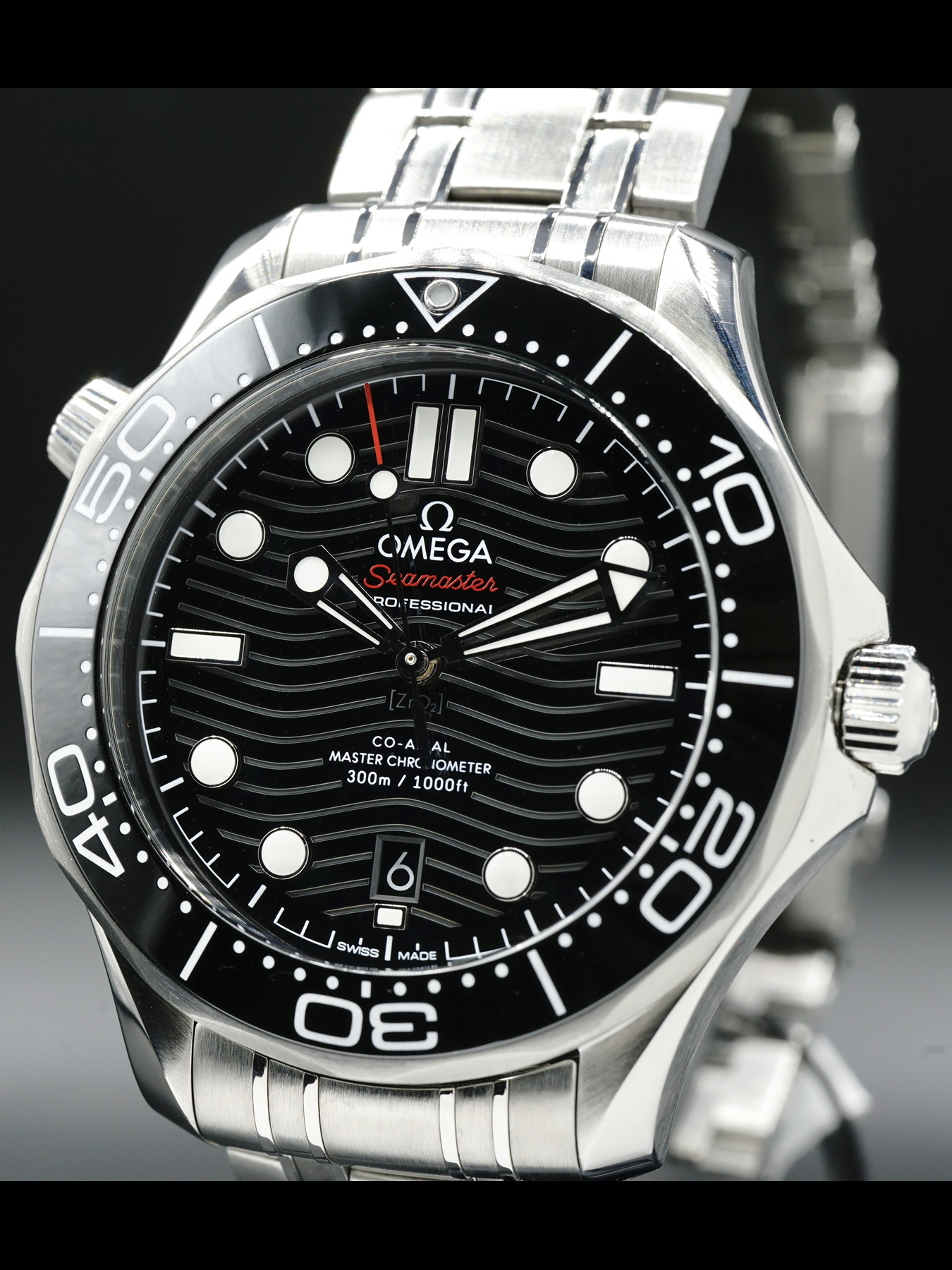 This Omega Seamaster Diver 300m features a 42mm stainless steel case on a stainless steel, silver-tone bracelet. This watch also showcases a black dial with luminous rhodium-plated skeleton hands covered by domed scratch-resistant, anti-reflective sapphire crystal.