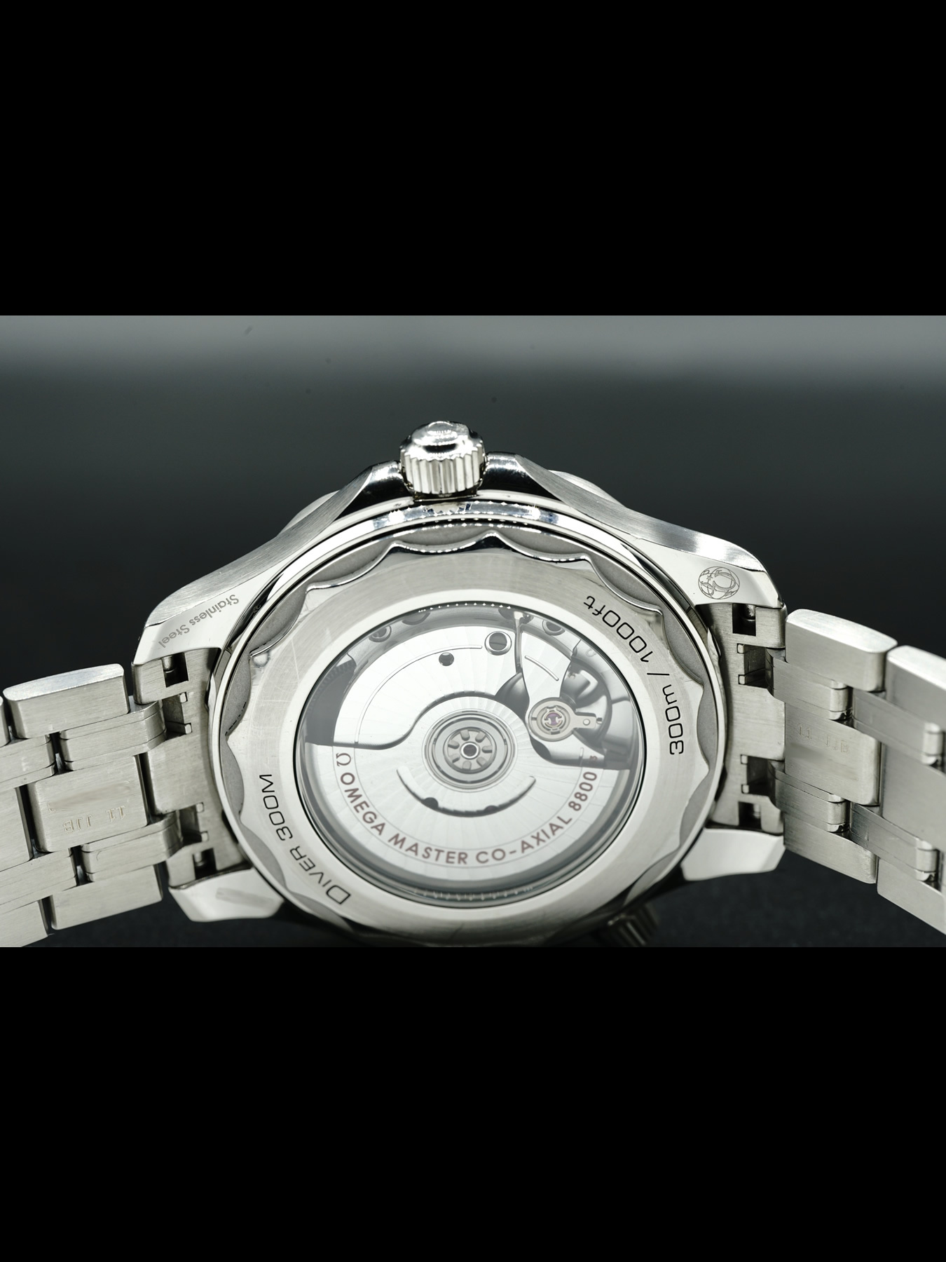Powered by Omega Calibre 8800 for a power reserve of approximately 55 hours. Water resistance up to 300 meters (1,000 feet).