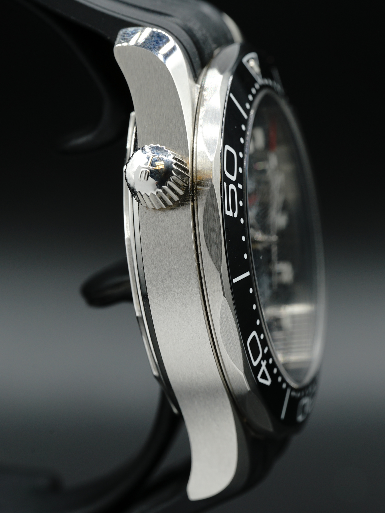 - This timepiece features a 42mm steel case paired with a high quality rubber strap. It showcases a distinctive black dial and is powered by a precise automatic winding movement. The watch is designed with a water resistance of up to 300m.
