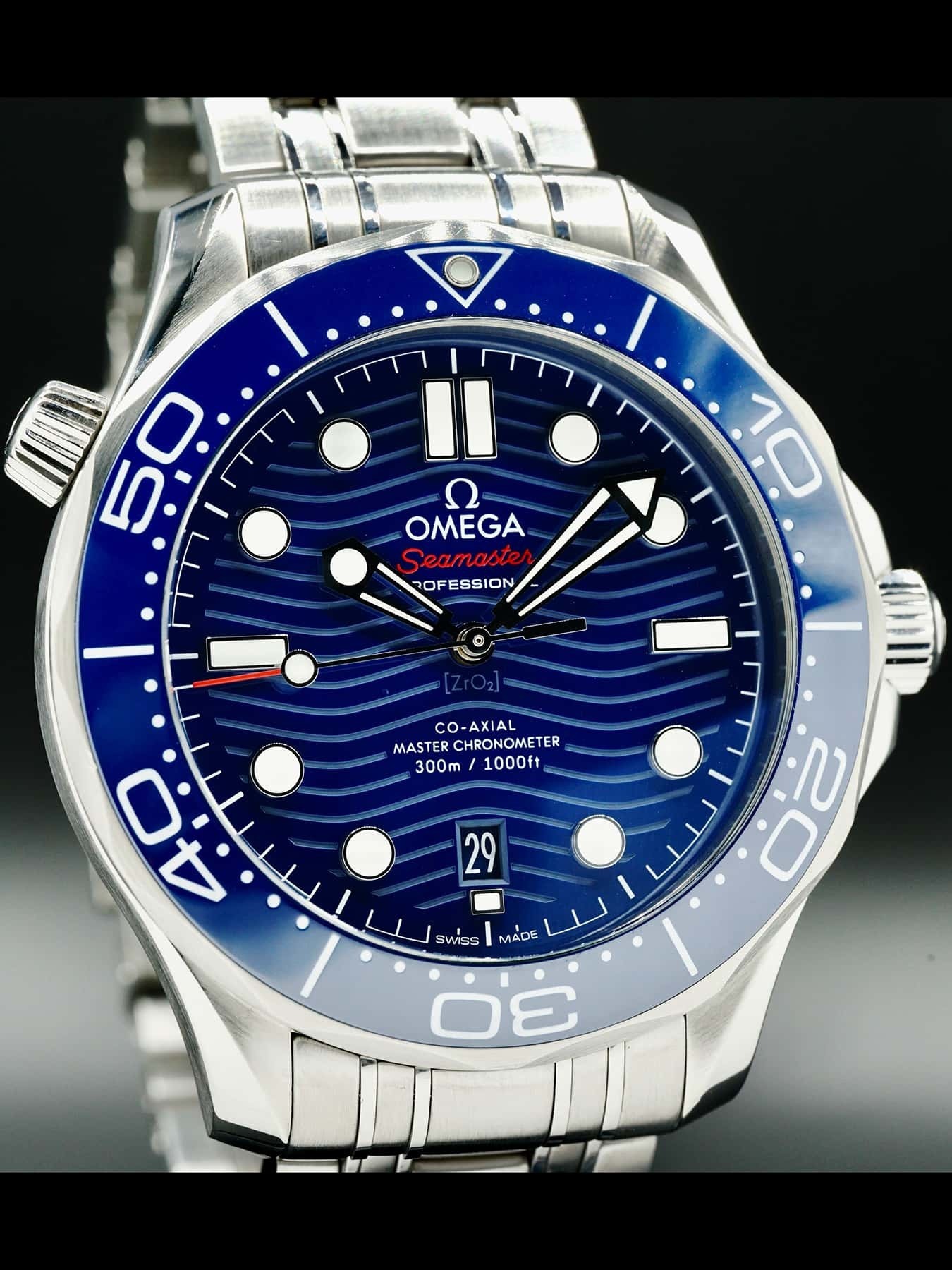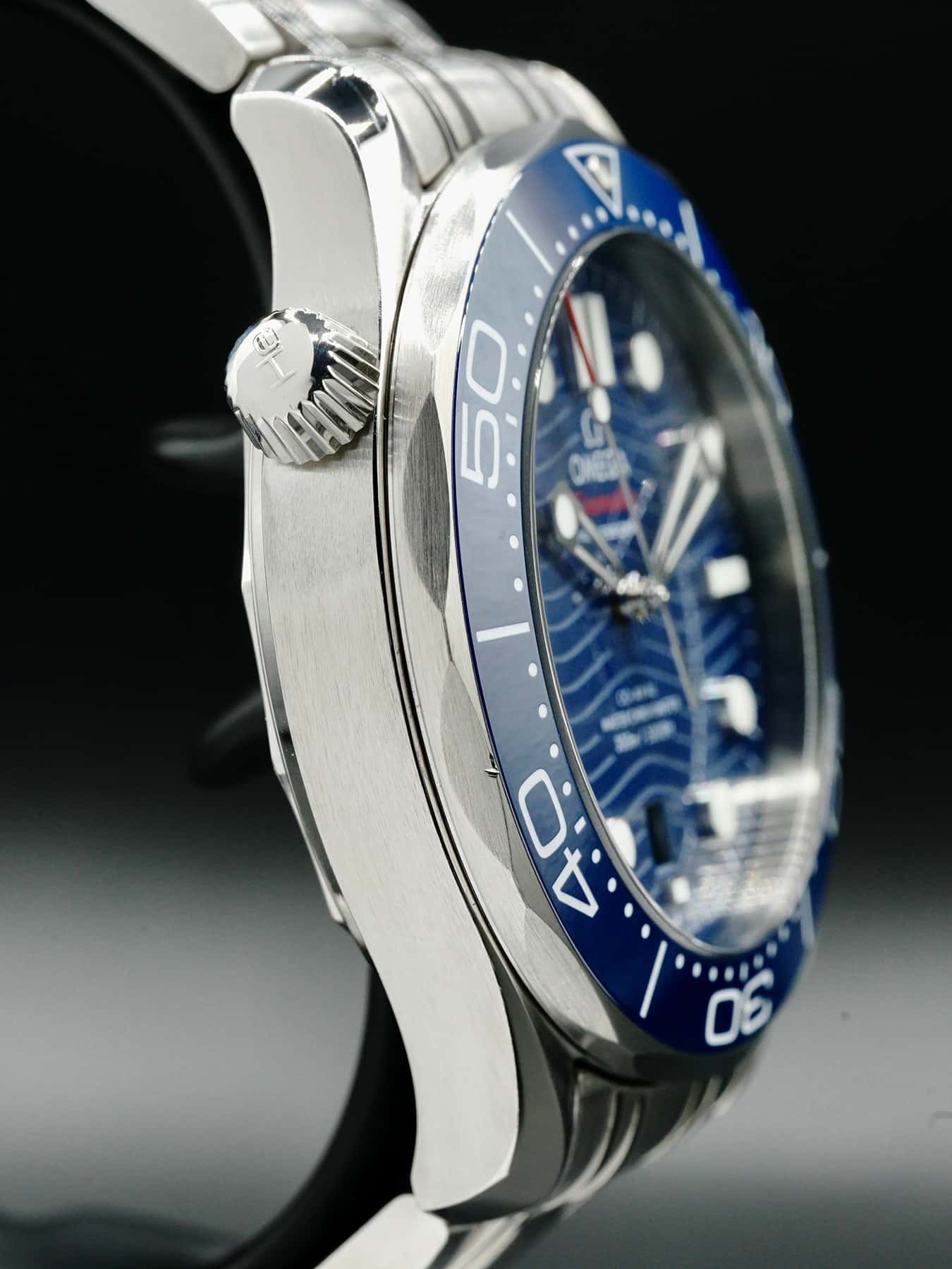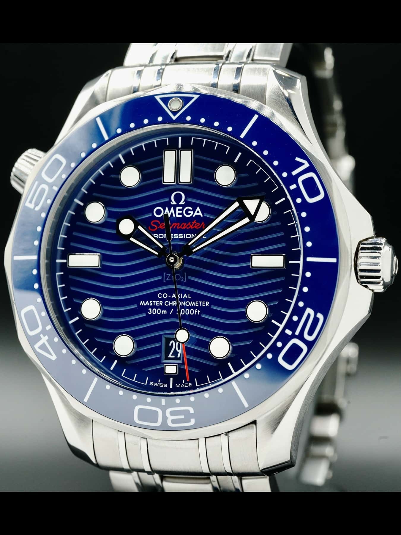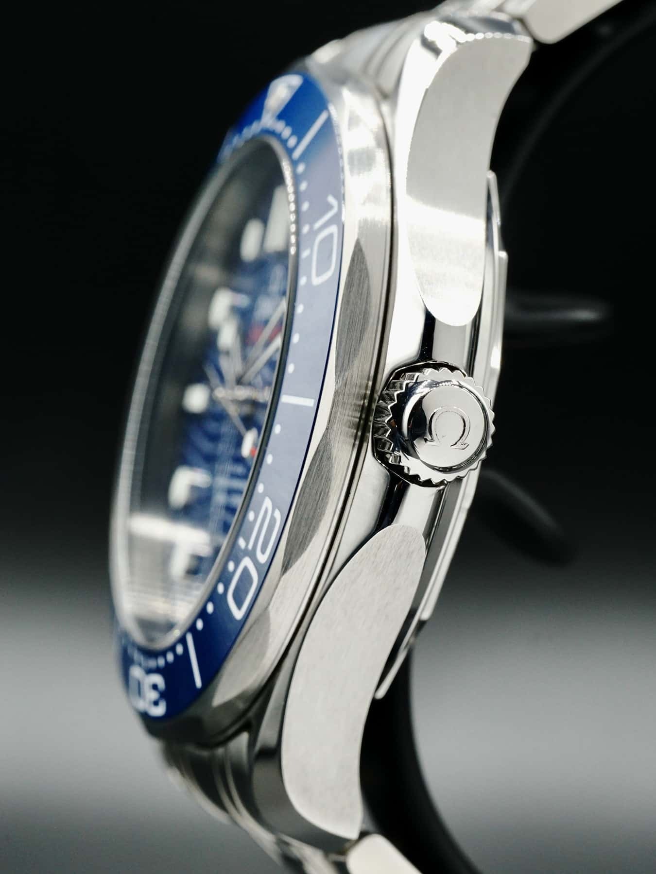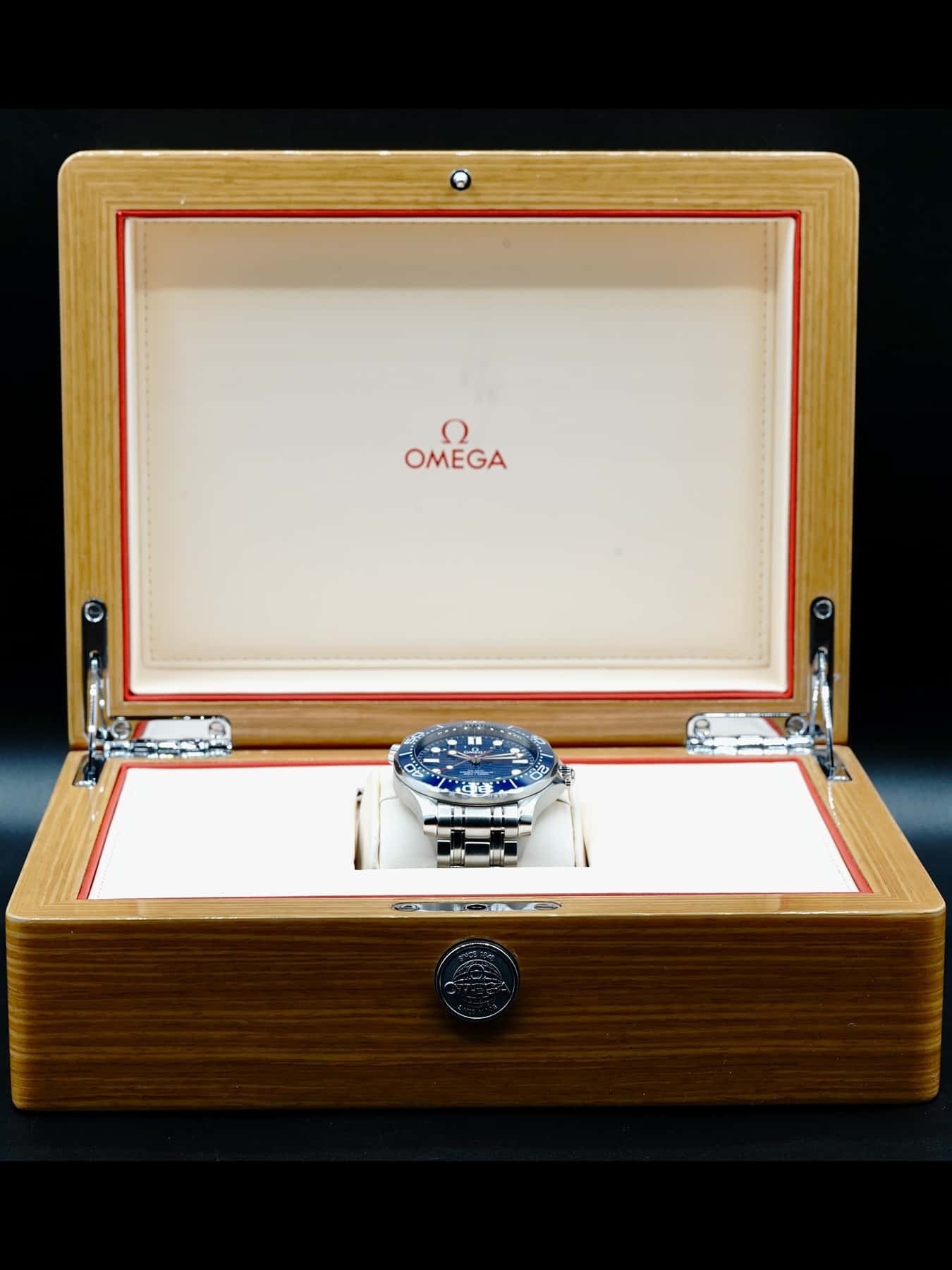 This Omega Seamaster Diver 300M features a 42mm stainless steel case with a blue ceramic bezel and a display case back on a stainless steel bracelet. This watch also sports a blue dial with luminous hands, index dial markers, and date display covered by anti-reflective sapphire crystal.