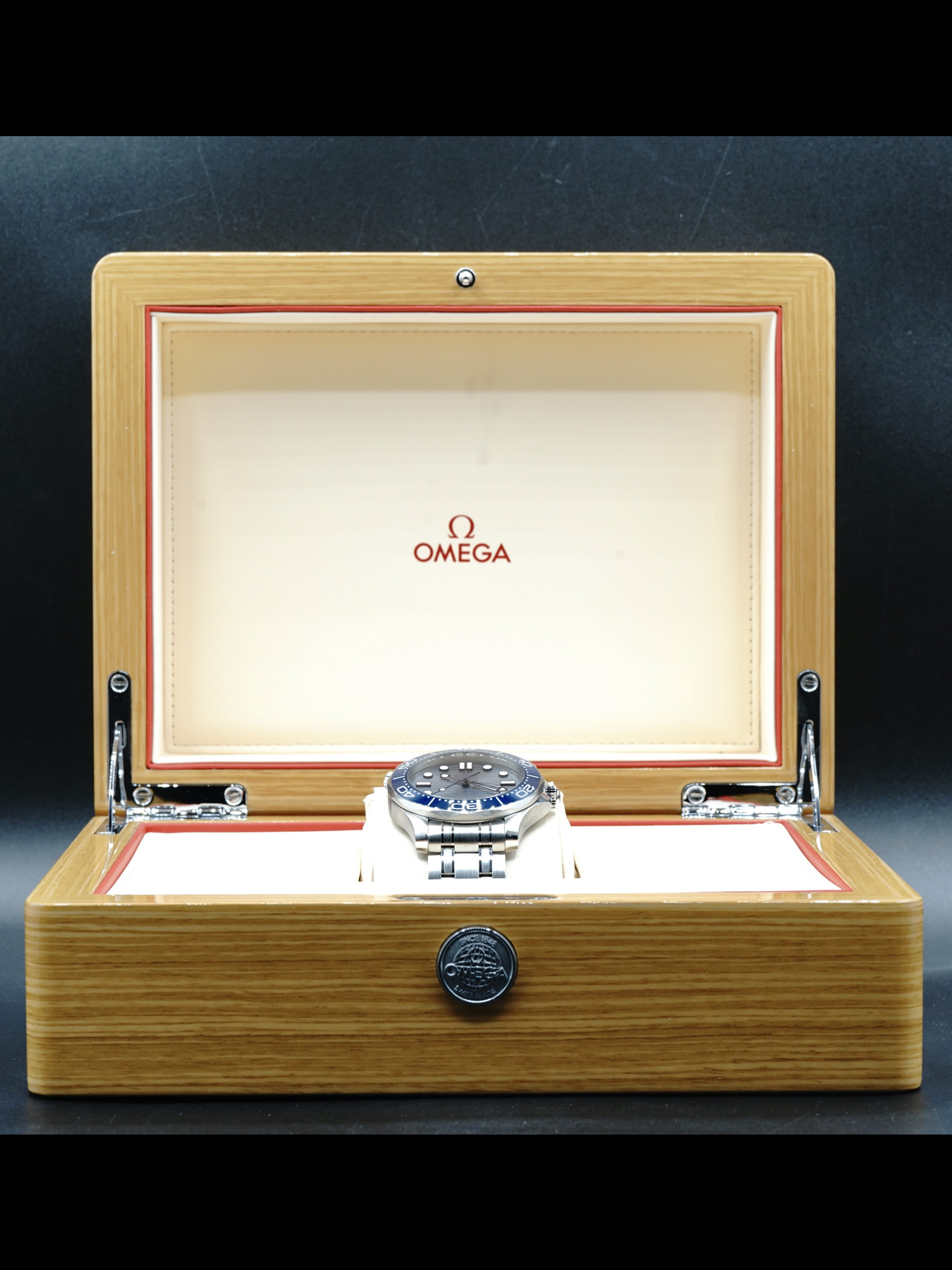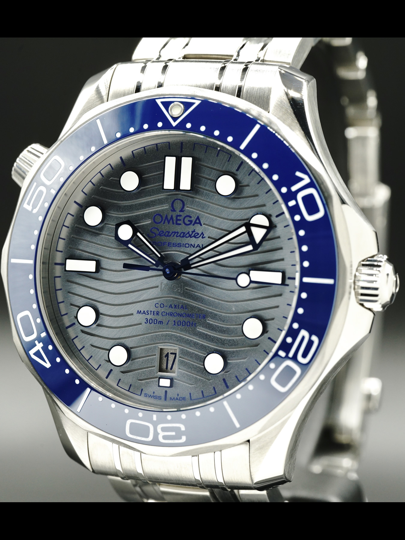 This Omega Seamaster Diver 300M features a 42mm stainless steel case and a stainless steel with blue ceramic ring bezel. This watch also showcases a grey (waves) dial with luminous blue skeleton hands covered by scratch-resistant sapphire crystal.