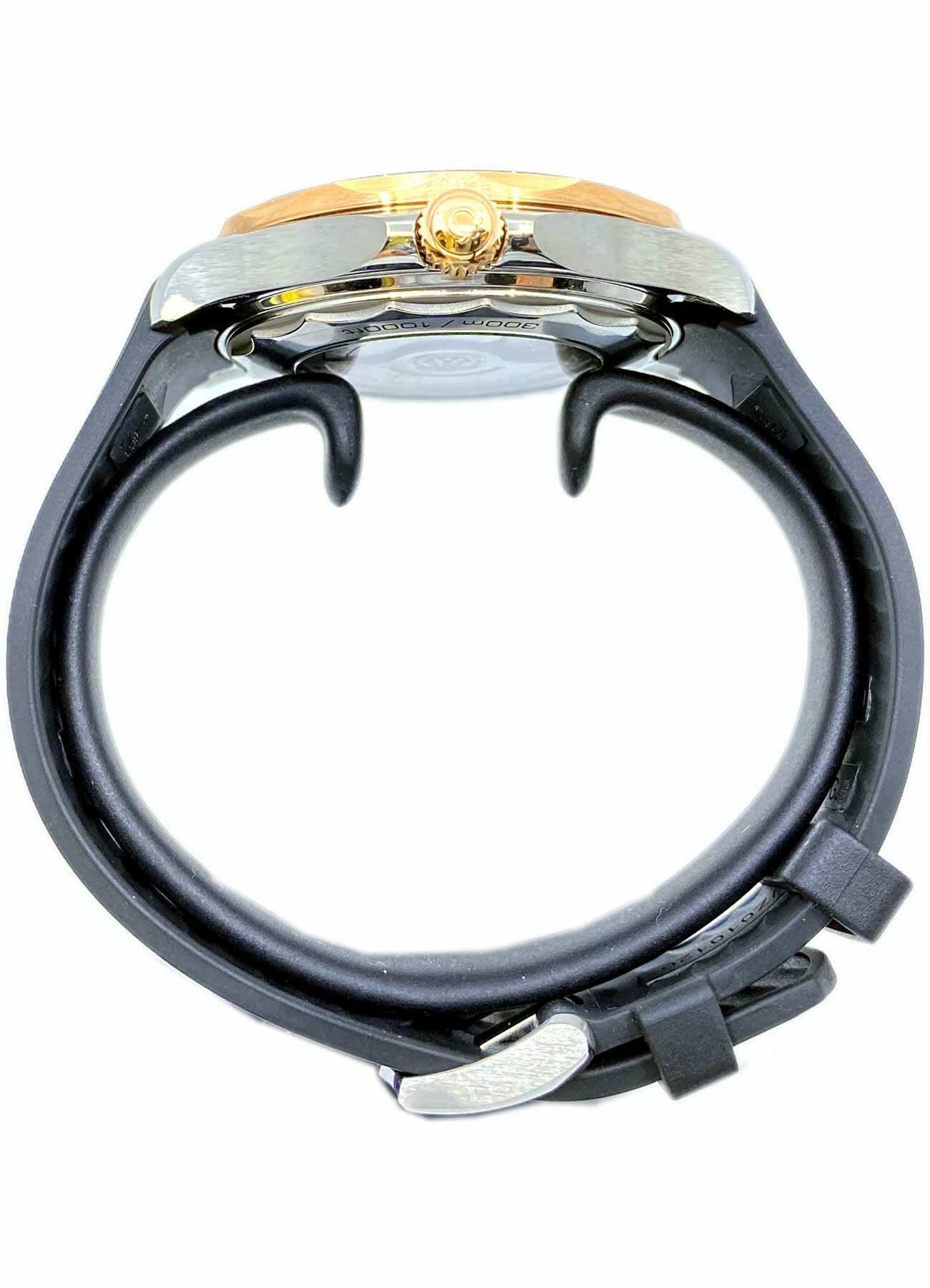 - This timepiece features a 42mm steel and gold case paired with a high quality It showcases a distinctive black dial and is powered by a precise automatic winding movement. The watch is designed with a water resistance of up to 300m.