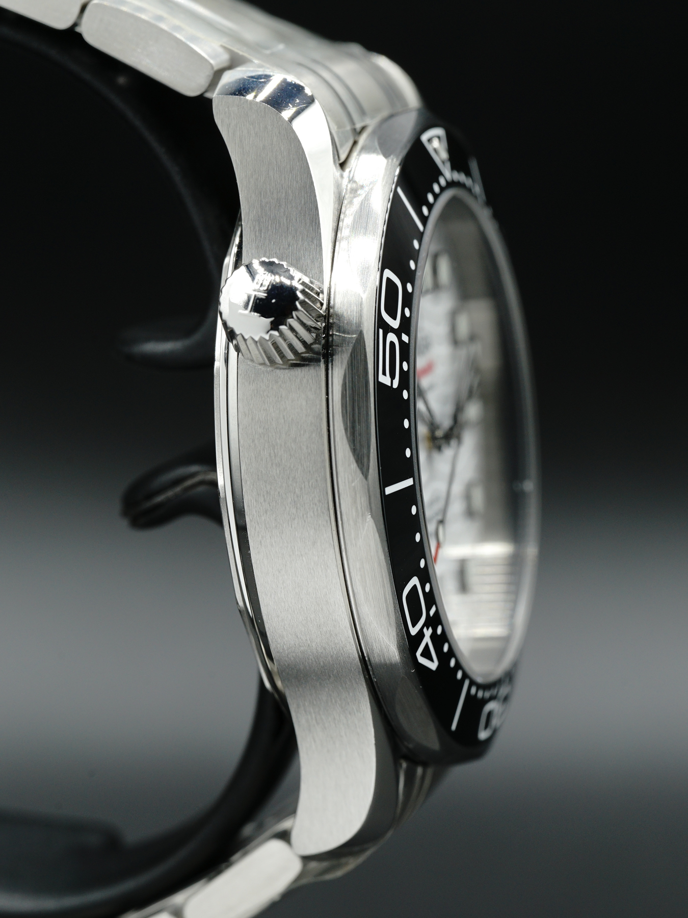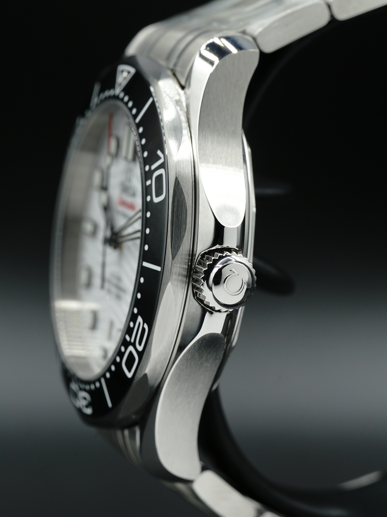 This 42 mm model is crafted from stainless steel and includes a black ceramic bezel with a white enamel diving scale. The dial is polished white ceramic and features laser-engraved waves and Seamaster highlighted in red. The polished, blackened skeleton hour and minute hands are filled with white Super-LumiNova. The seconds hand features a varnished red tip. The watch is presented on a polished-brushed stainless steel bracelet and is driven by the OMEGA Master Chronometer Calibre 8800, which can be seen through the sapphire-crystal on the wave-edged caseback.