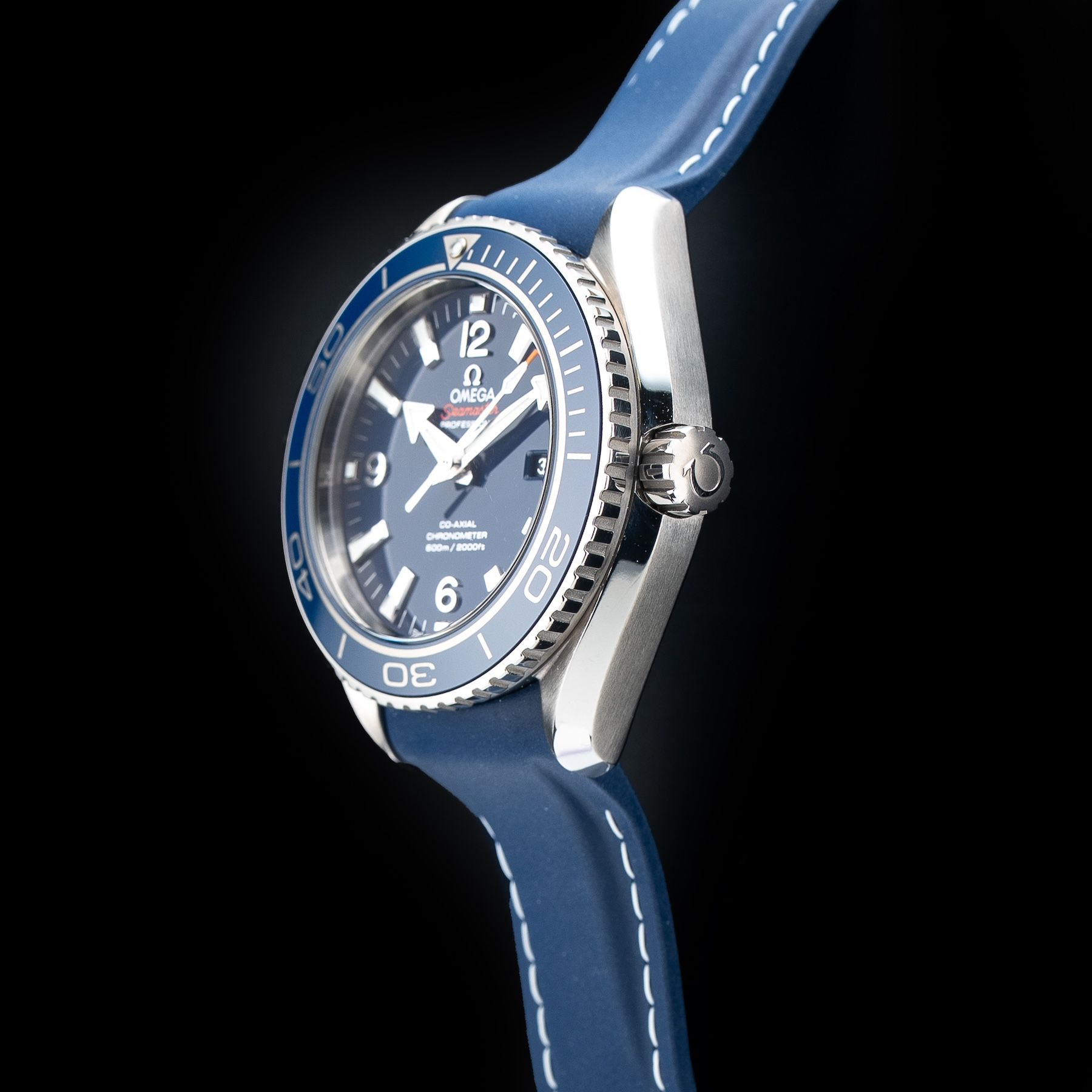 This watch features a 37.5mm titanium case on rubber strap. This watch also sports a blue dial. Powered by a Omega Co-Axial calibre 8520 movement. Water resistance up to 600 meters.