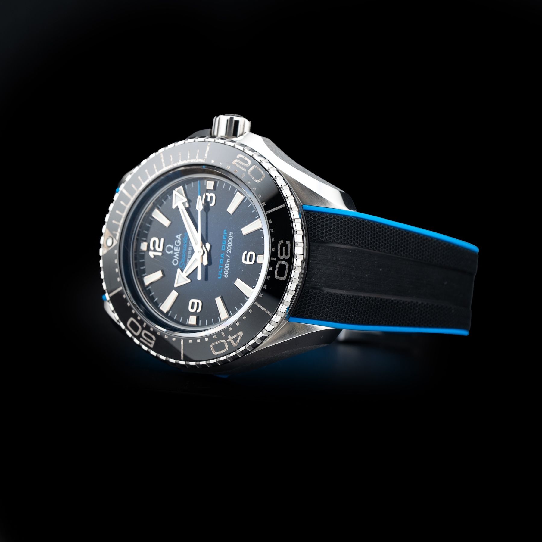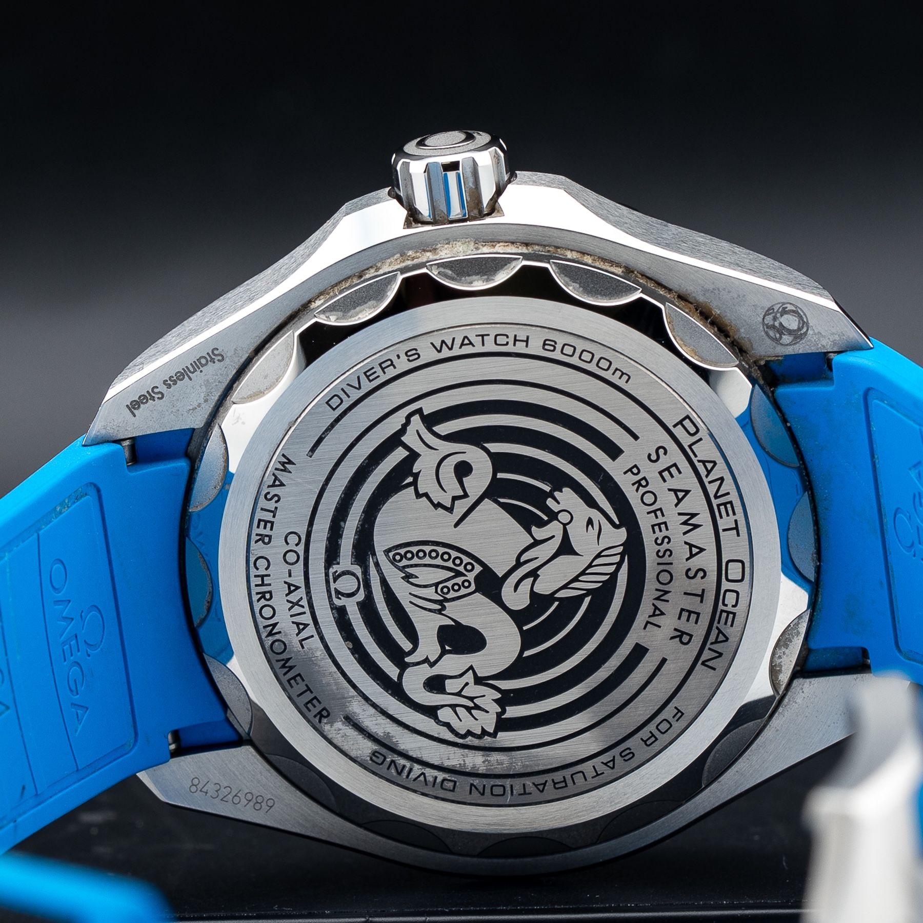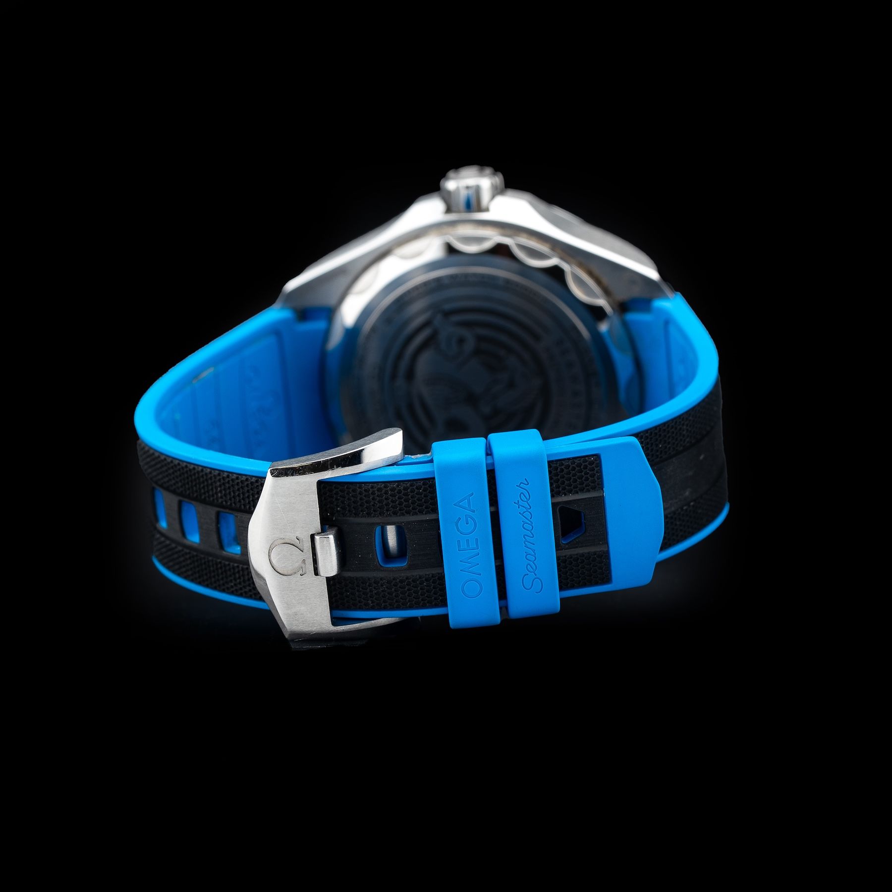 This watch features a 45.5mm O-Megasteel case on rubber strap. This watch also sports a blue dial. Powered by a mechanical automatic movement. Water resistance up to 6000 meters.