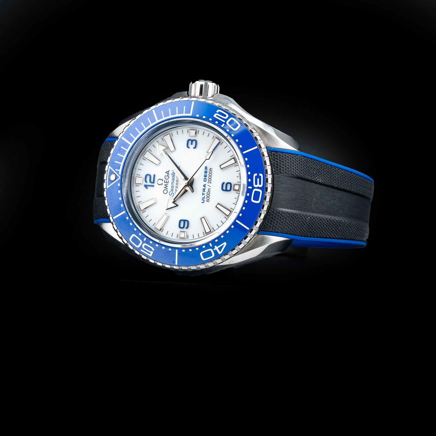 This watch features a 45.5mm O-Megasteel case on rubber strap. This watch also sports a white dial. Powered by a mechanical automatic movement. Water resistance up to 6000 meters.