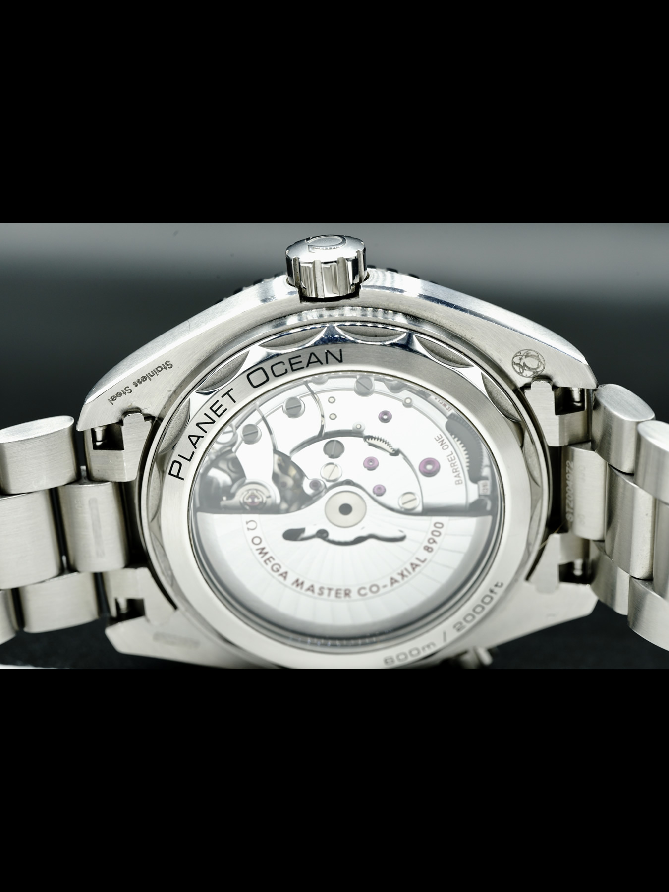This Omega Seamaster Planet Ocean 600M features a 43.5mm stainless steel case & black ceramic bezel with a transparent sapphire case back on a stainless steel bracelet. This watch also showcases a black dial with luminous silver-tone arrow-shaped hands and index dial markers covered by scratch resistant sapphire crystal.